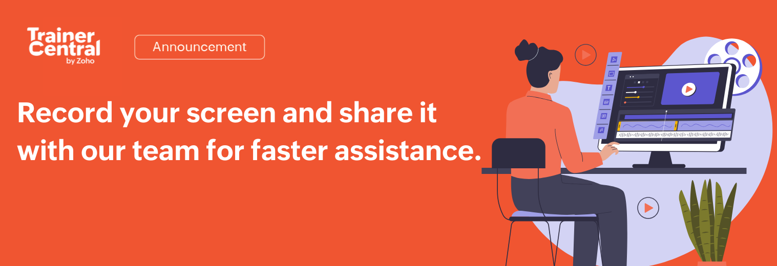 At TrainerCentral, we always strive to provide trainers with a smooth user experience. However, sometimes you may require assistance from our support team to proceed further. To address this, we’ve launched our own built-in Screen Recorder that allows you to capture your screen. To top it off, you can also report the issue to our support team with just a single click.