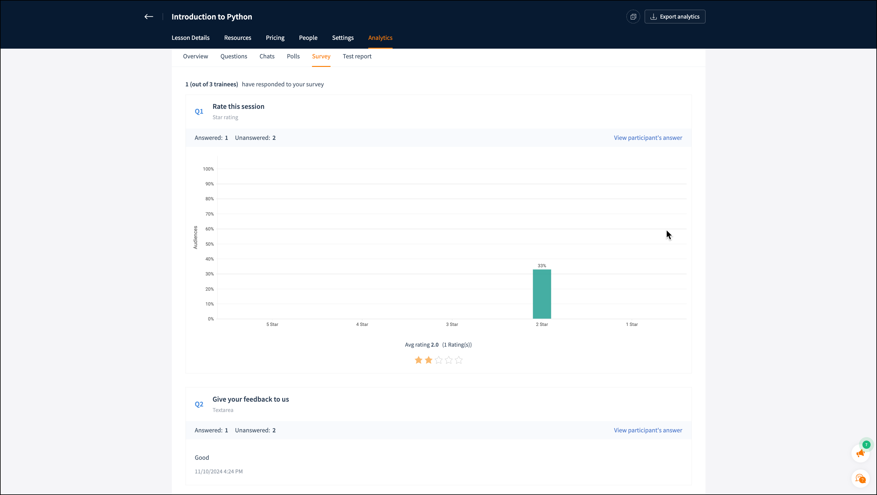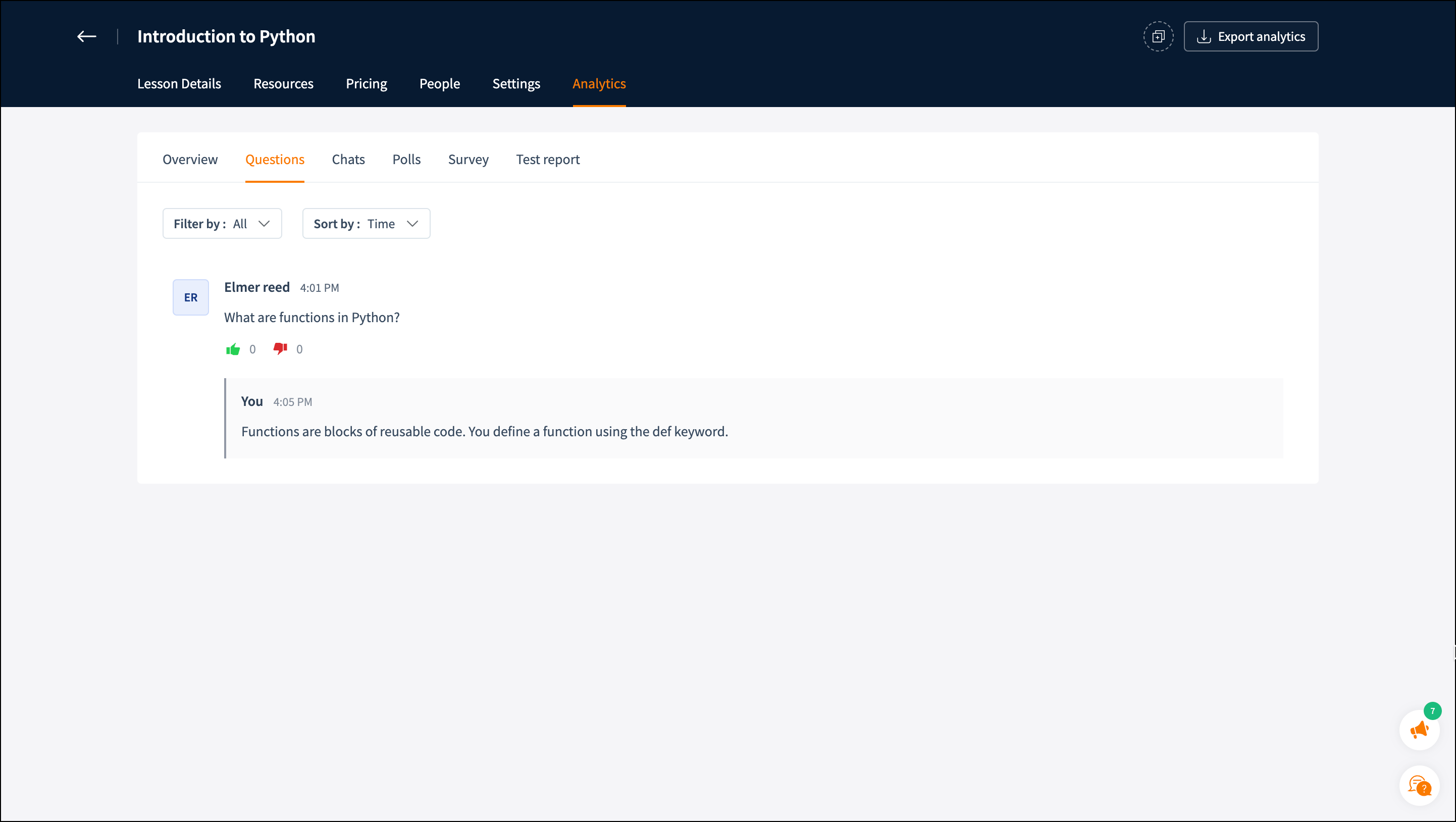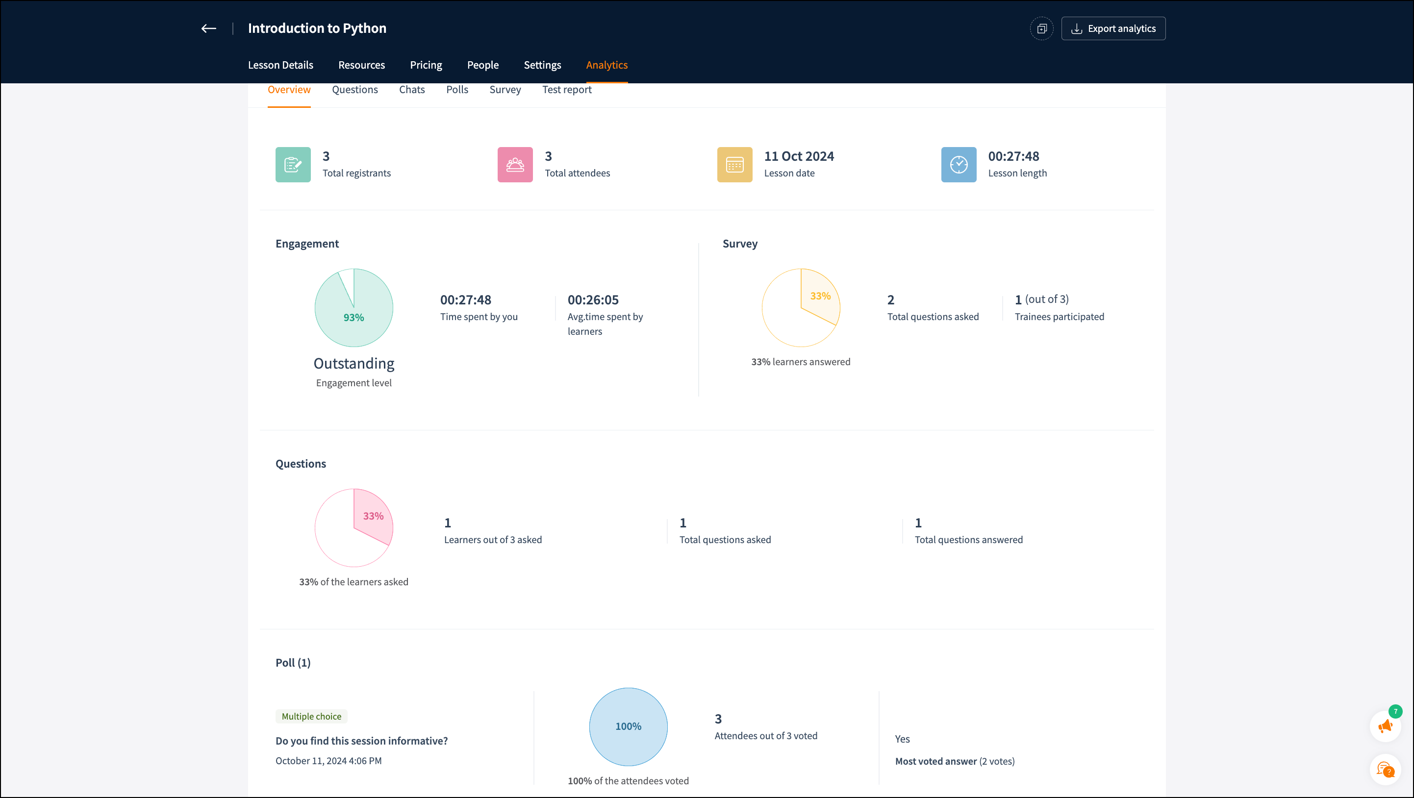 Analyzing chats and questions gives you an overview of the session's reach and a detailed evaluation of attendees' comprehension of the session.