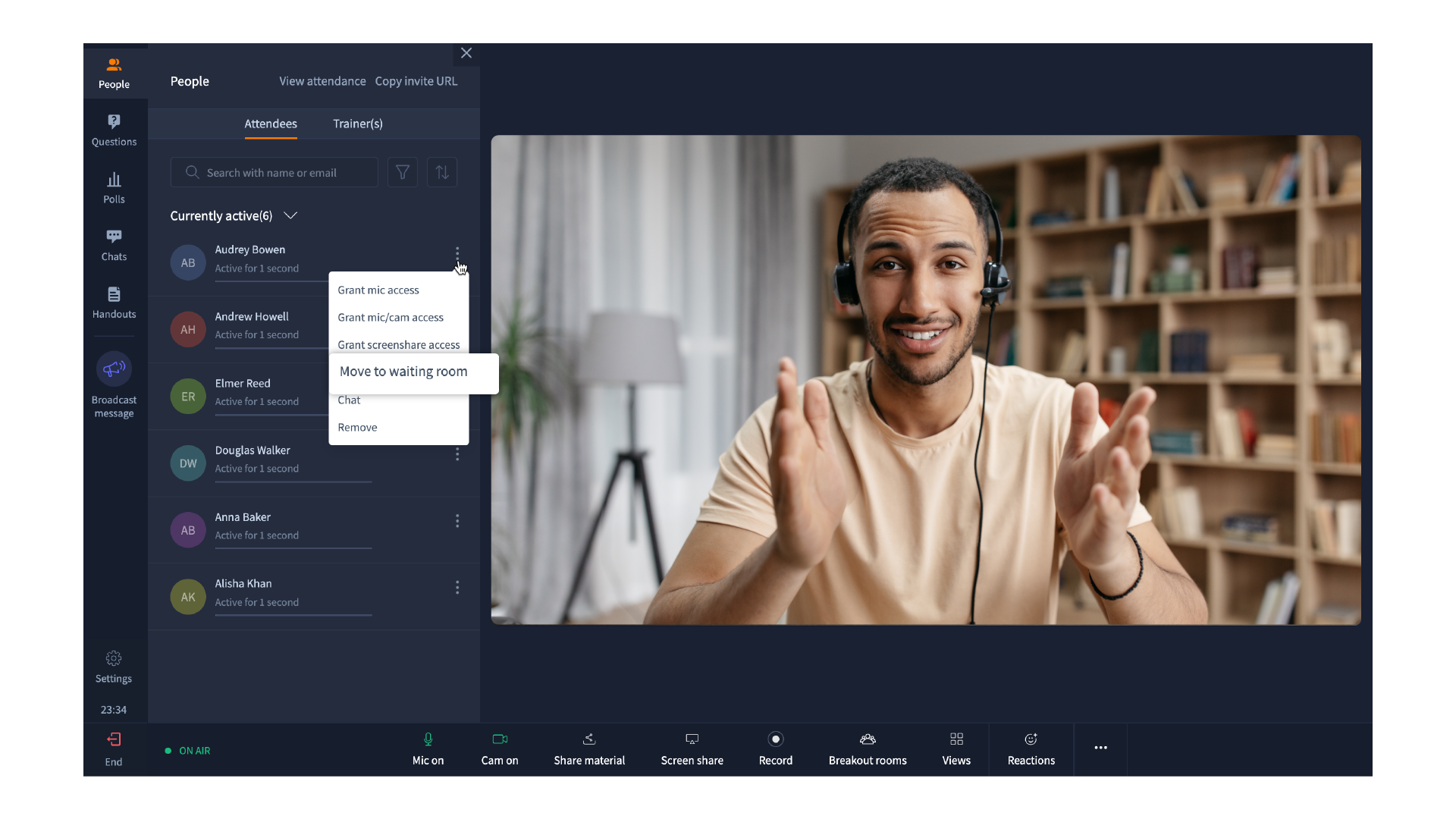 Once the virtual waiting room is enabled, he can add the required materials, verify the audio and video settings, and review the attendees' details. He’ll be notified when attendees enter the waiting room, and he’ll be able to view the list of attendees and grant access to them individually or in bulk as needed.