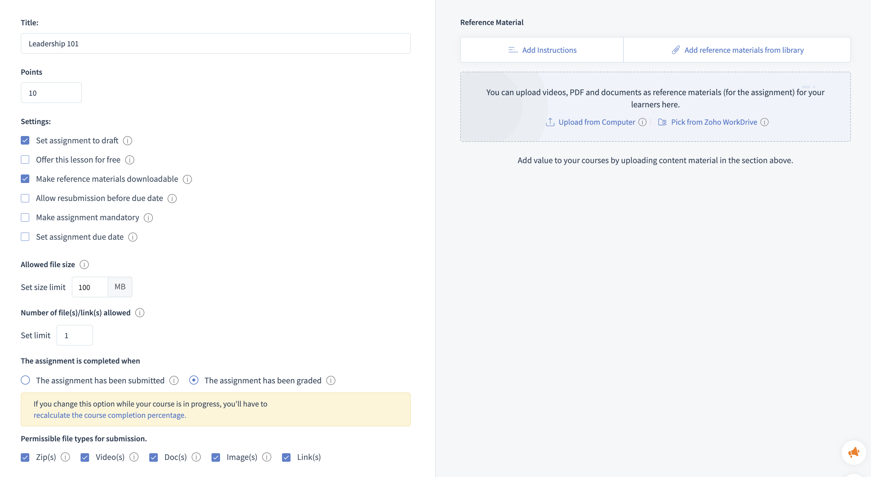 For courses that involve practical skills or fieldwork, trainers can use TrainerCentral Assignments to collect and evaluate learners' field-based experiences. Learners can submit reports, photos, or videos showcasing their application of concepts in real-world settings.