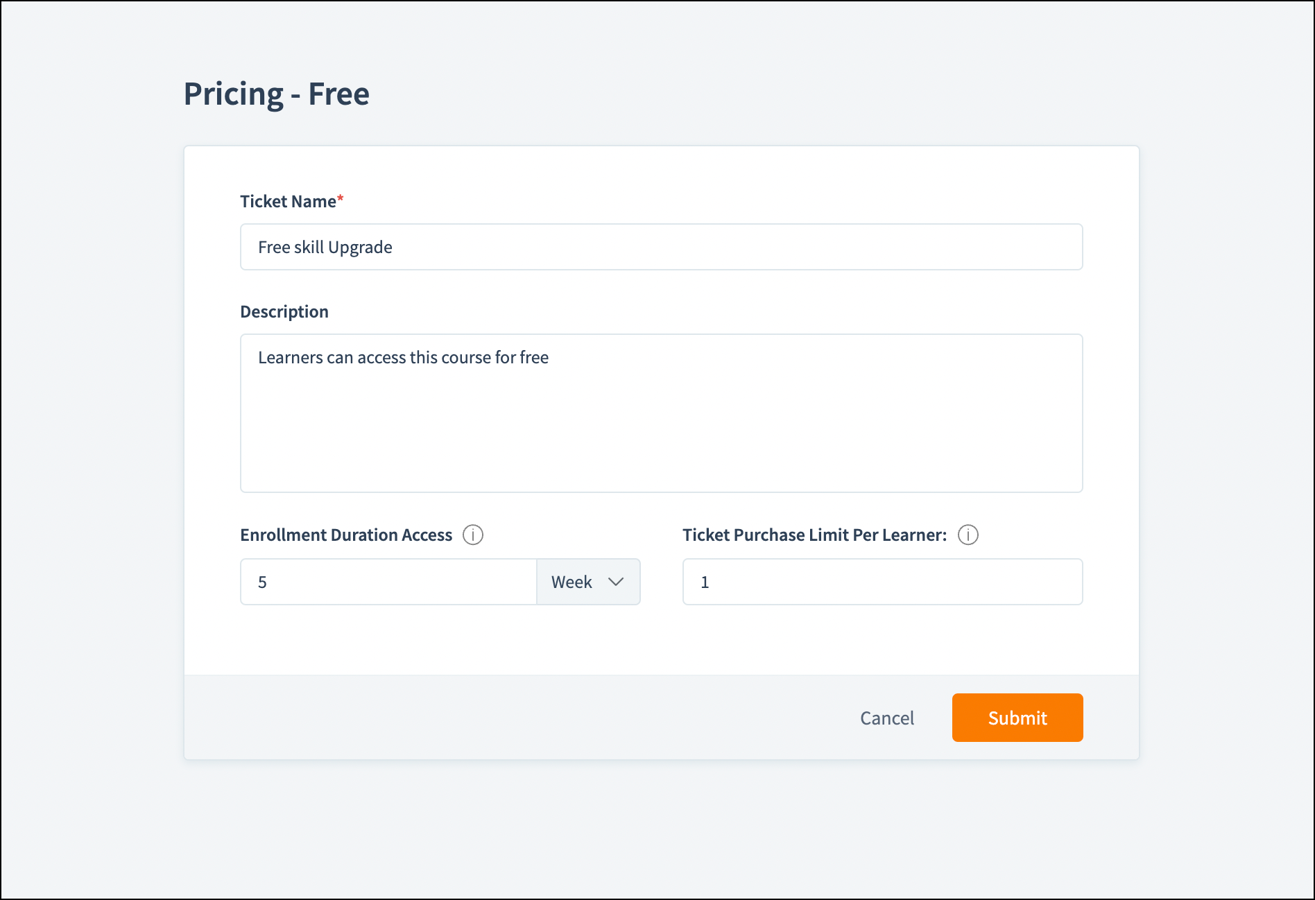 Let's say Sarah, a trainer at Zylker Training Academy, and has created a course titled “Business English” for her learners. She offers a free ticket, “Free Skill Upgrade” and sets the course access to one week and the ticket purchase limit per learner to one. Learners who purchased the free ticket will have access to the course for one week. They won’t be able to access the course after one week or use the ticket again because they’ve maxed out the access duration and ticket usage. To continue their learning, they need to purchase another ticket. In short, this feature gives you control on how tickets can be purchased and used by learners.