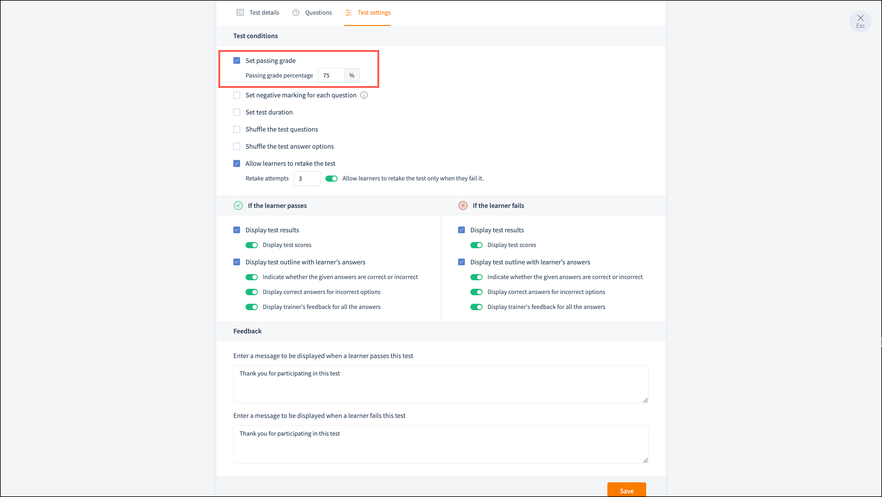 You can also enable the Allow learners to retake the test feature to help them secure a passing grade if they fail to achieve it in the first attempt.