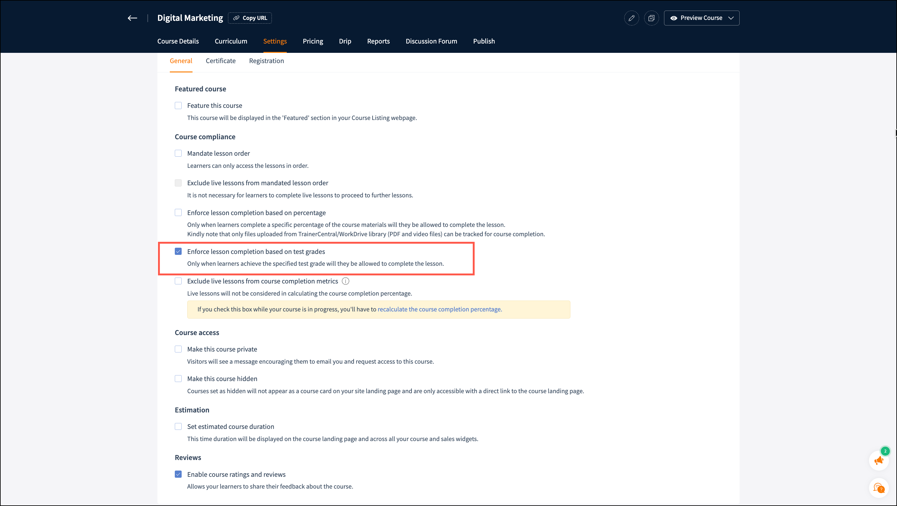 Select the Enforce lesson completion based on test grades option. This setting will prevent your learners from completing the lesson until they secure passing grades on tests.
