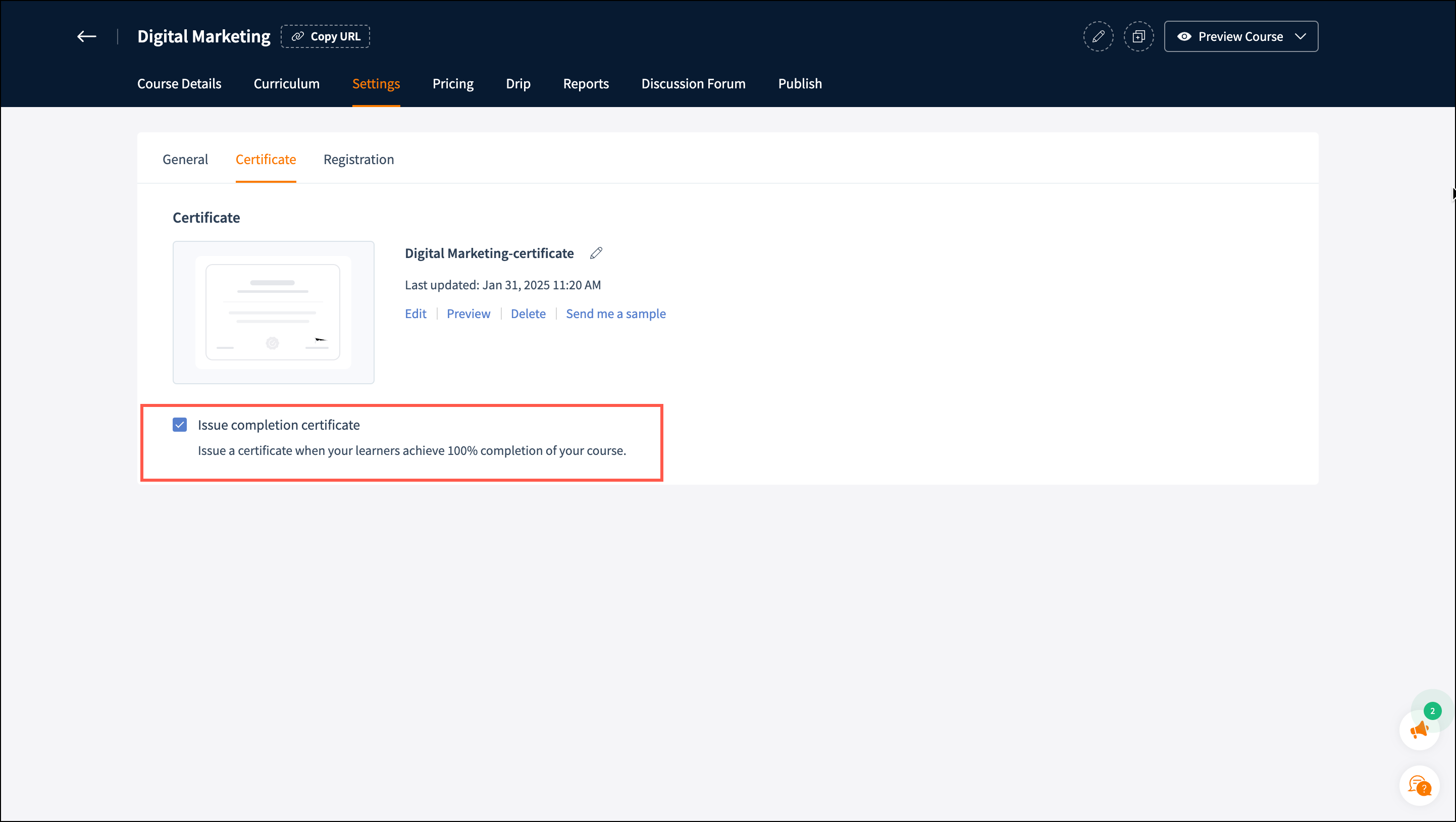 Learners must secure passing grades on added tests to achieve 100% course completion. Once they do, a certificate will be automatically issued to them.