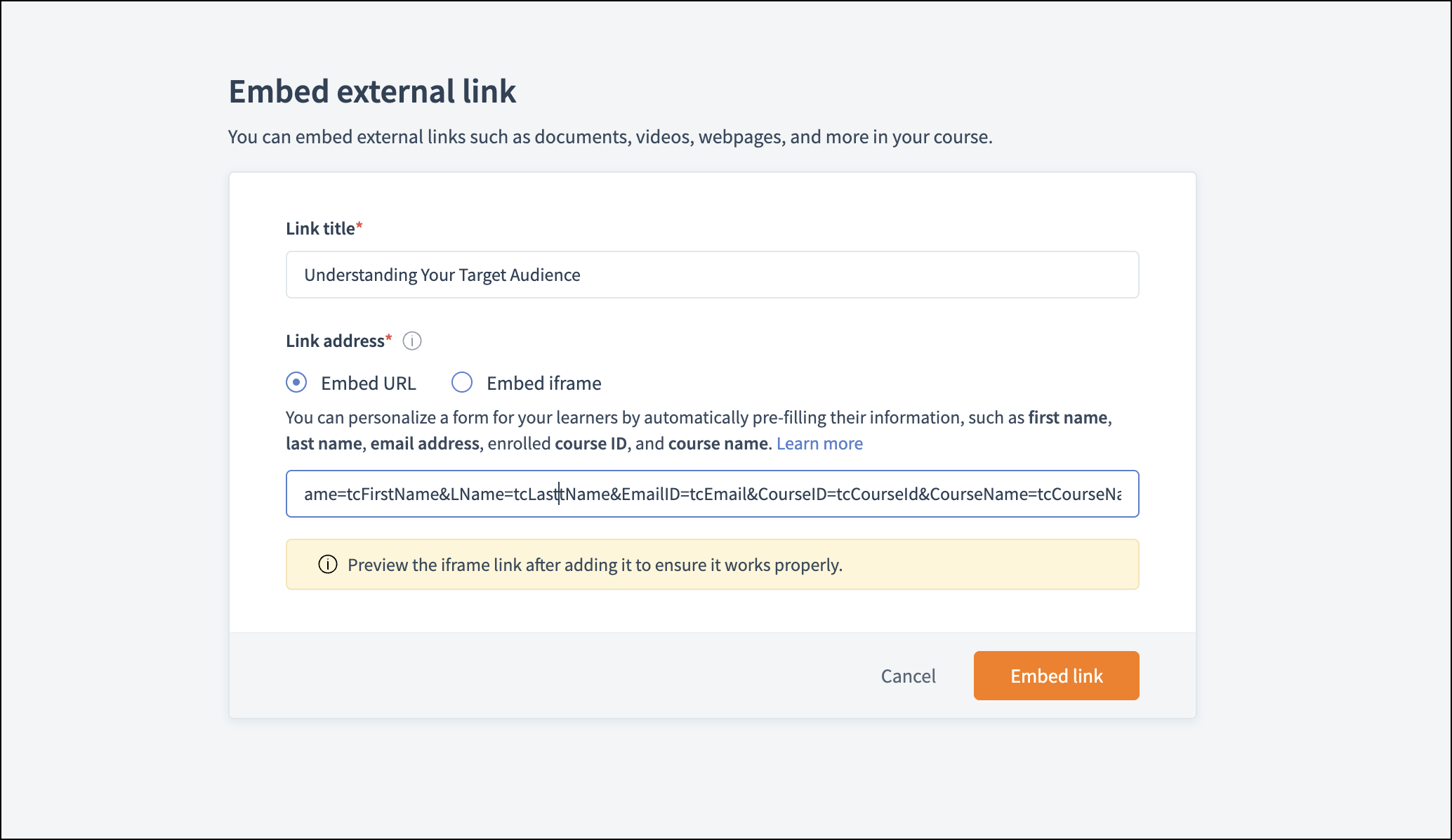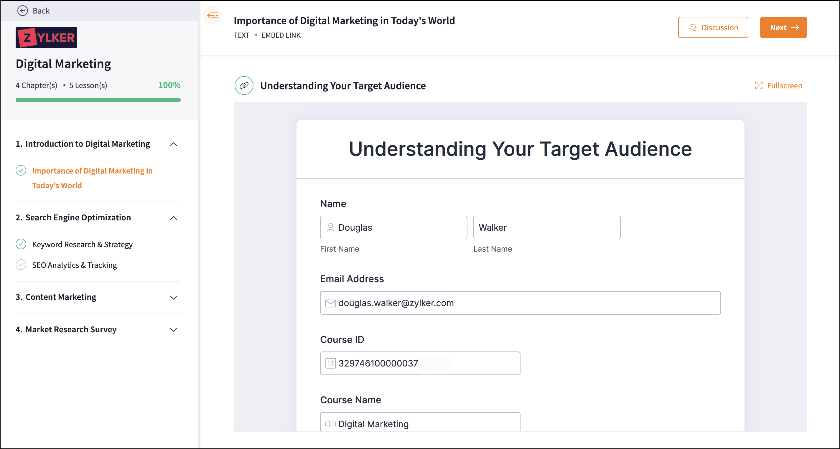 As a trainer, you always strive to understand how well your learners grasp each lesson. You can embed the form as part of the lesson material to collect learners’ feedback. To make this process smoother, you can use a pre-populated form, saving time and improving the learners’ overall experience.
