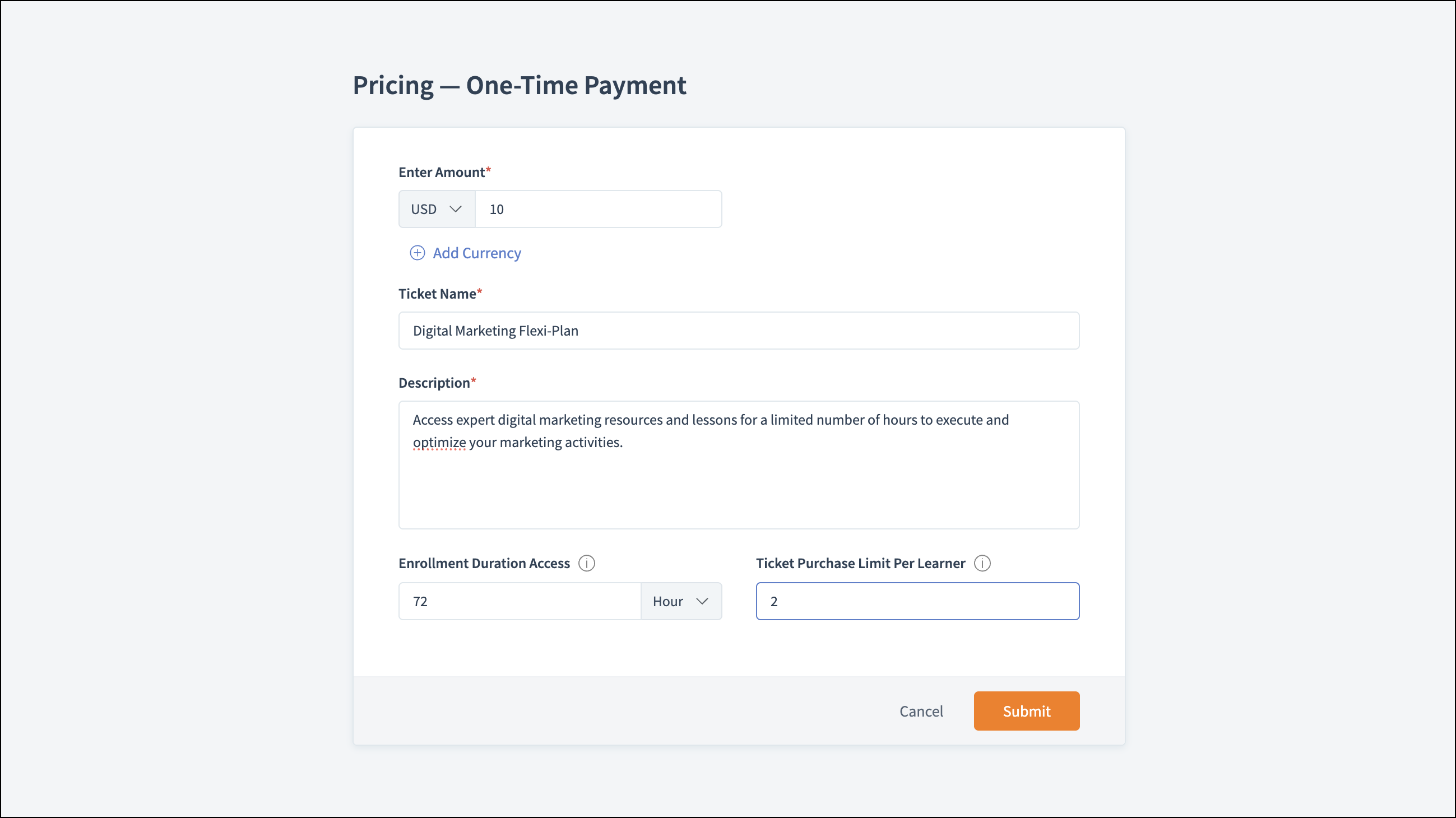 Imagine you create a SEO marketing course and offer your learners multiple ticket options, such as subscription, payment plans, and a one-time payment. Now as a strategic move, you can offer the one-time ticket as hour-based access, for example, 72 hours. This enables learners to enroll and start learning without a long-term commitment.