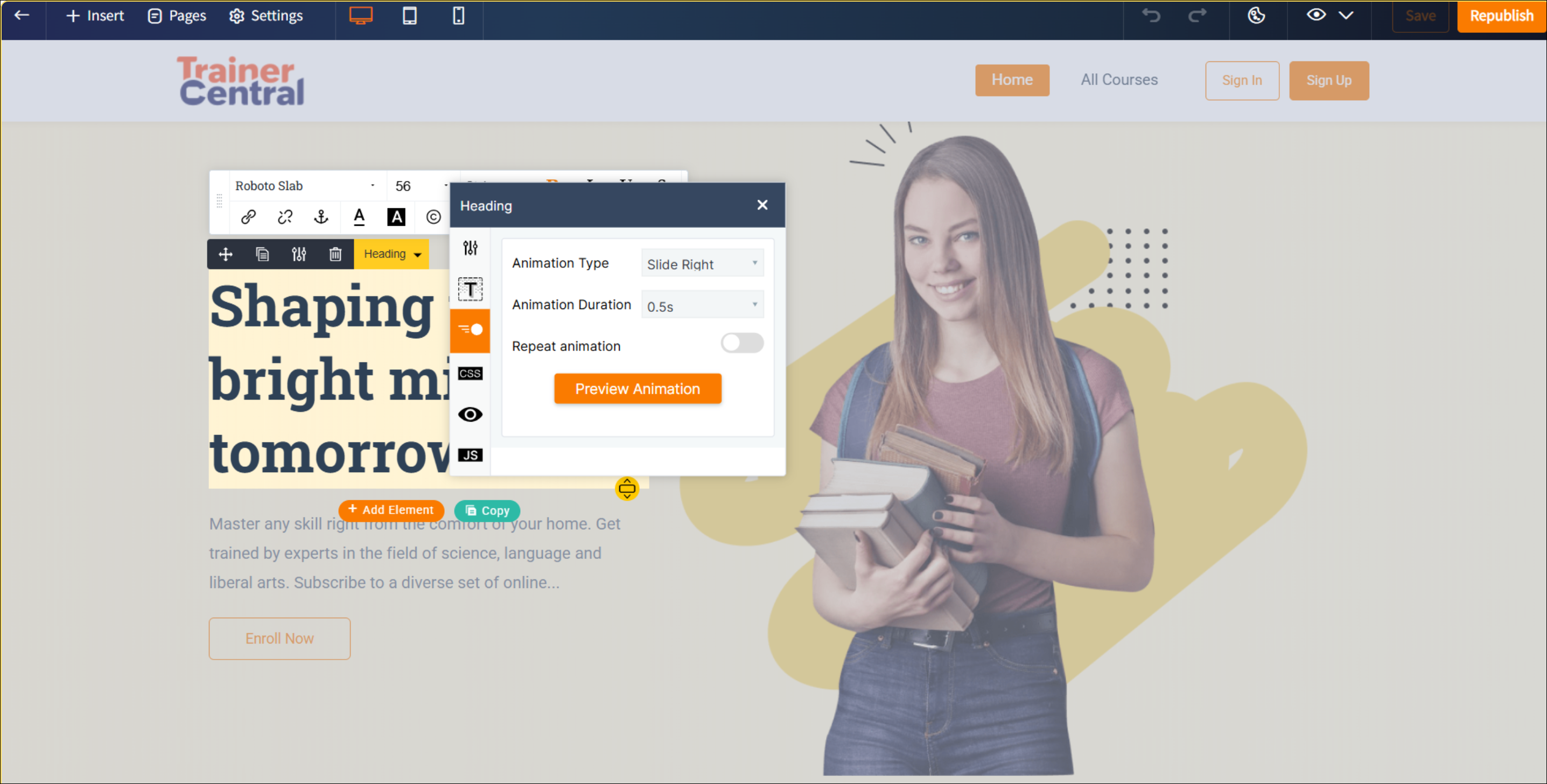 Animation: Apply it to elements to bring more liveliness, such as zoom, bounce, and flip on your content.