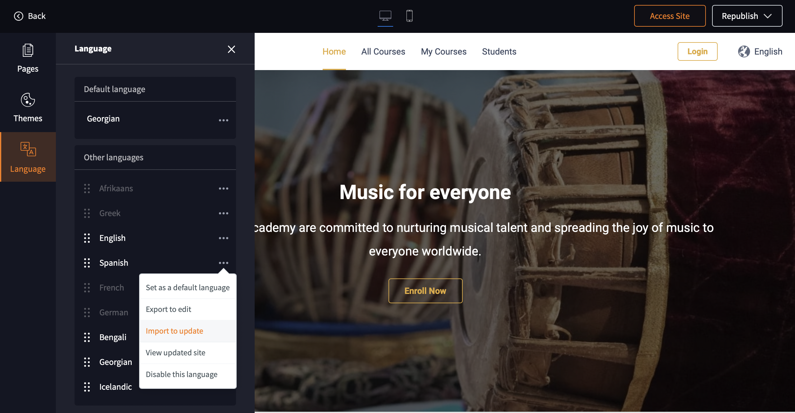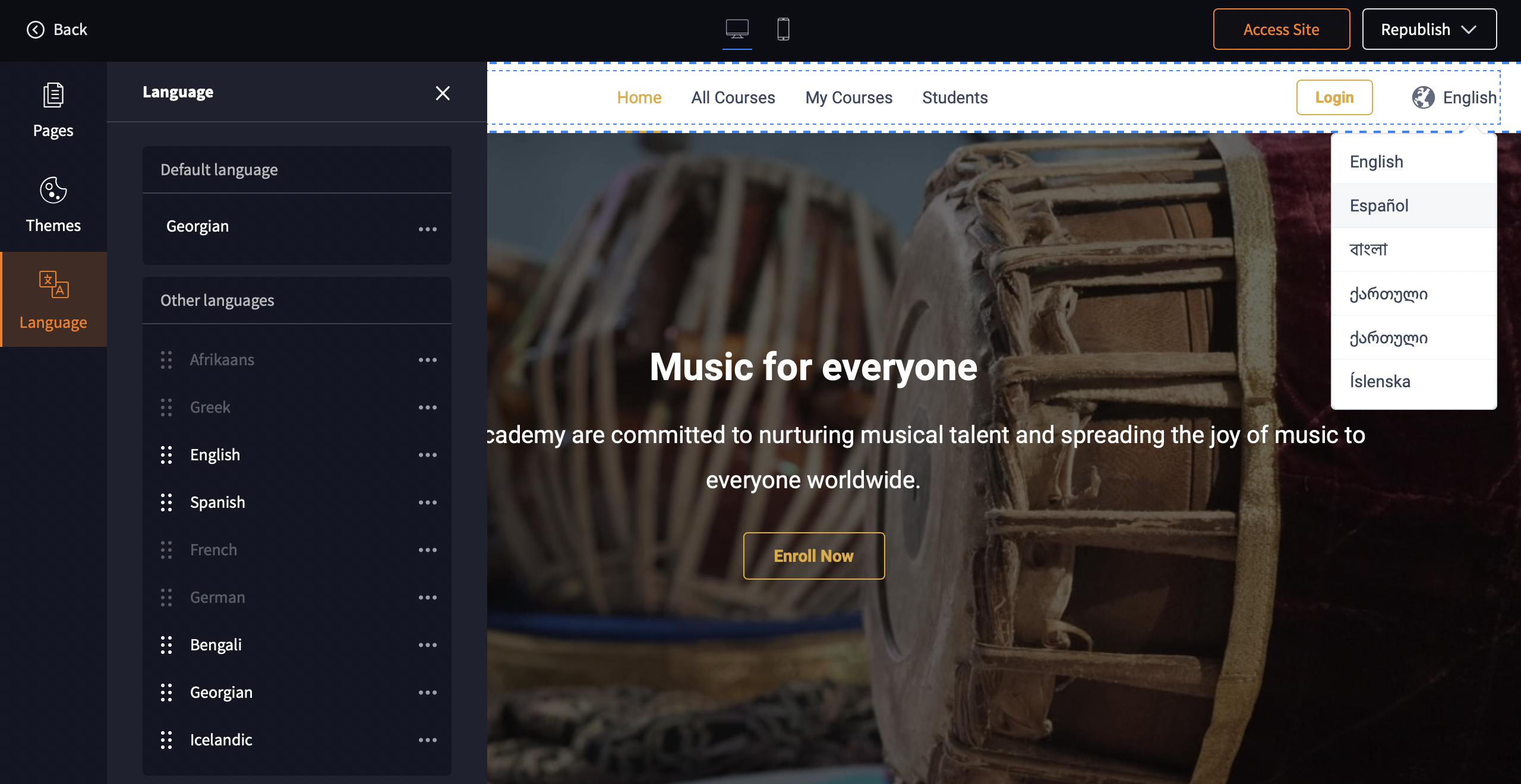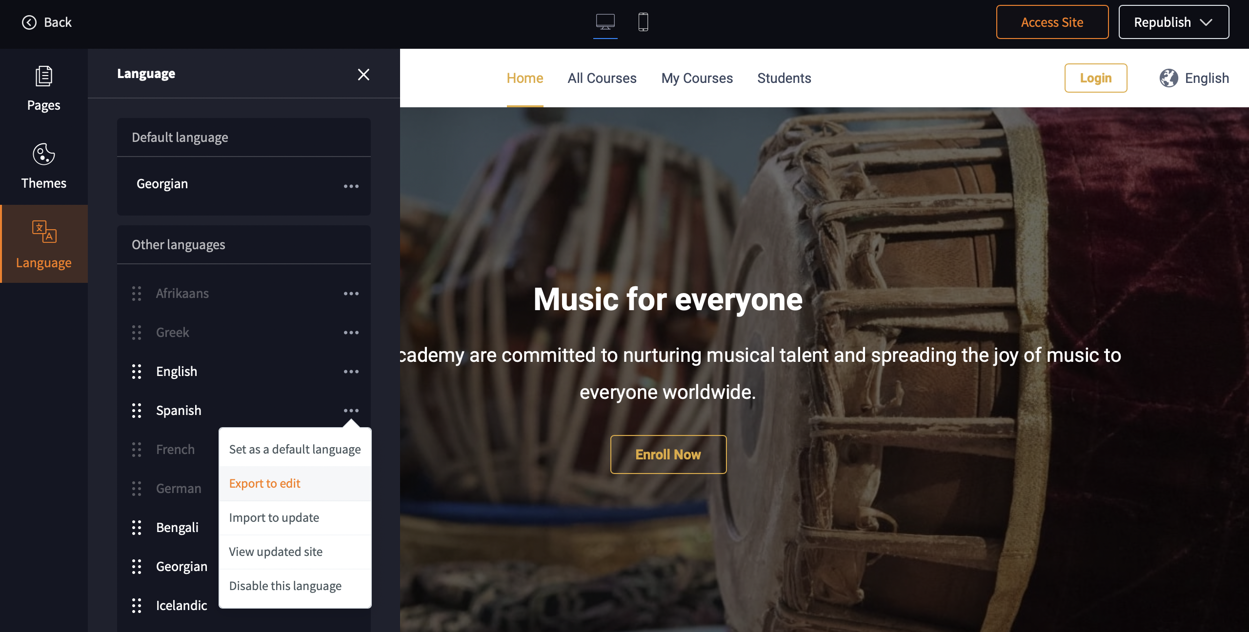 3. To set a language as the default language for the website, click on Set as Default language for that language to be displayed to all users.