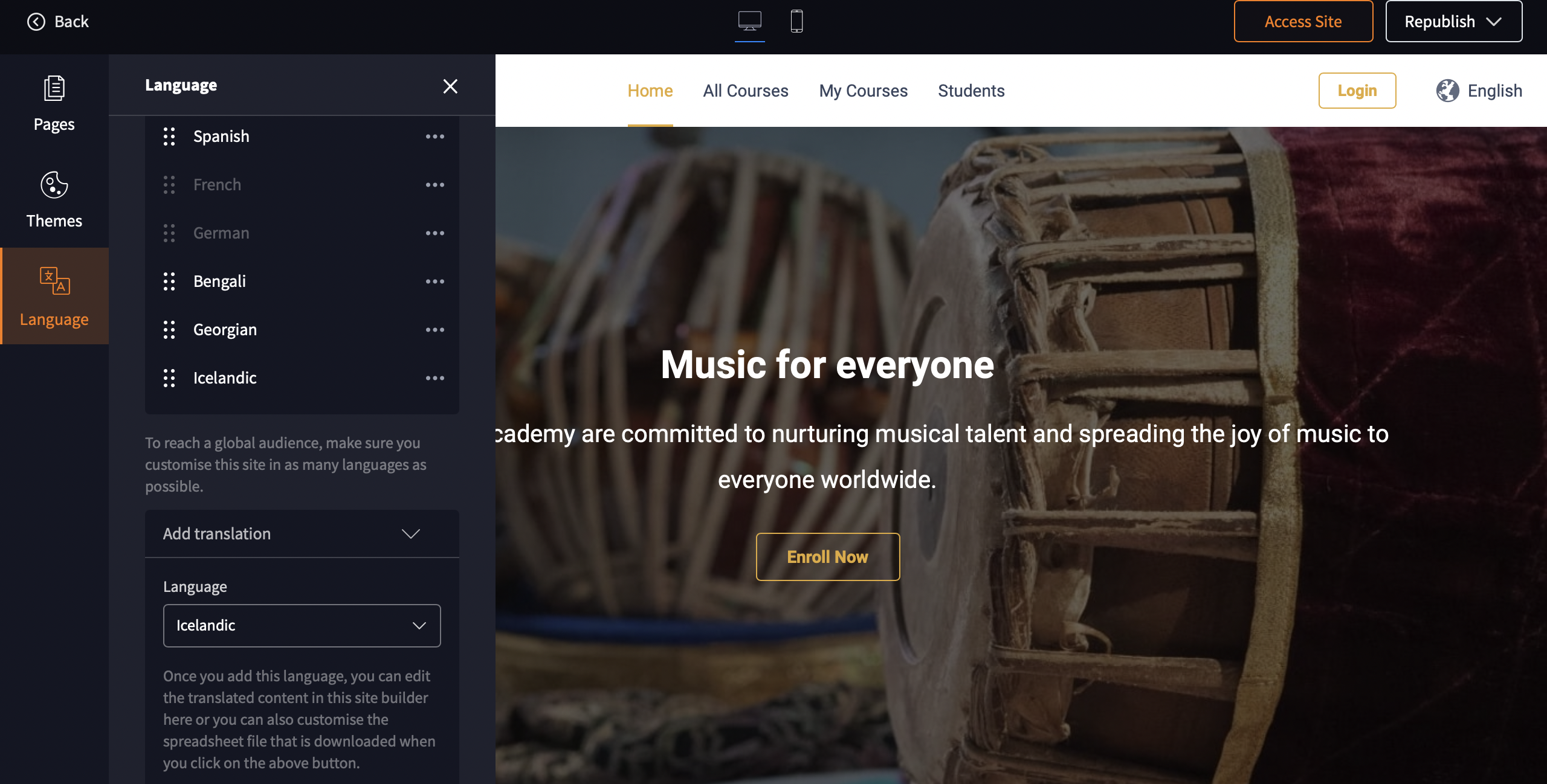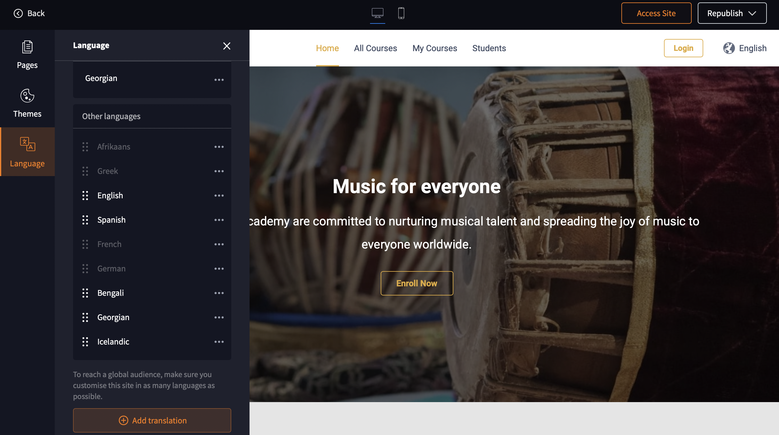 With e-learning reaching all across the globe, it is vital to have your webpages customized for all languages spoken by your target audience. TrainerCentral allows you add multiple translations to any of your customized webpages.