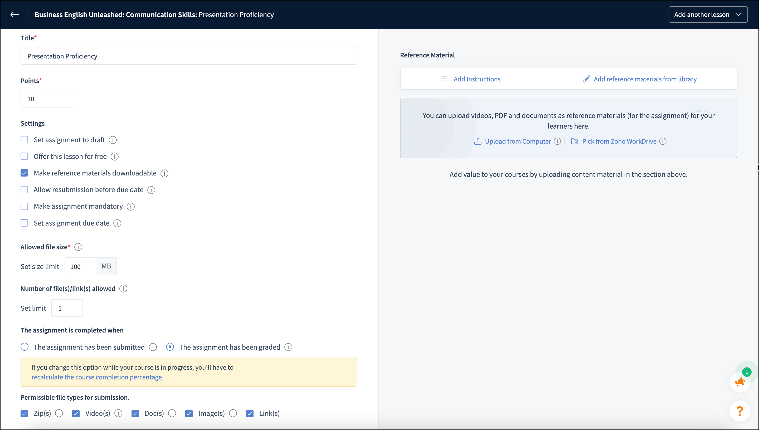 You can also attach the reference materials so that the learners can go through them before starting the assignment. You can select the reference material from the library, upload it from the computer, or pick from Zoho WorkDrive. The following reference material formats are supported: pdf, video, image, document, audio, spreadsheet, video, and zip file. These will be displayed on the screen.