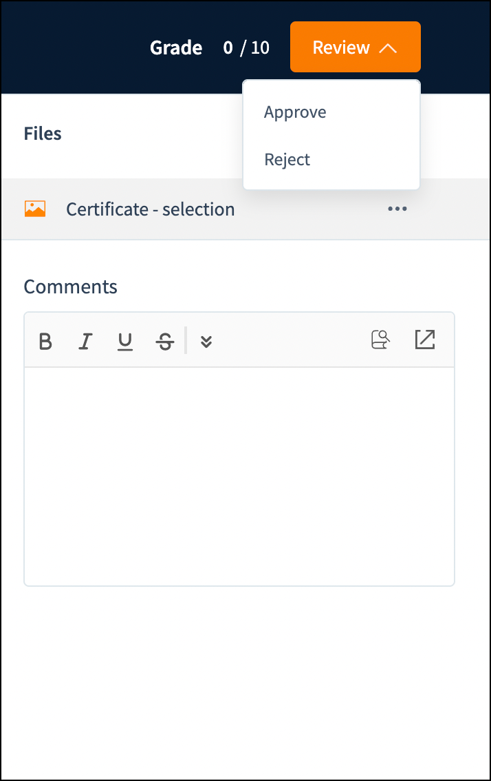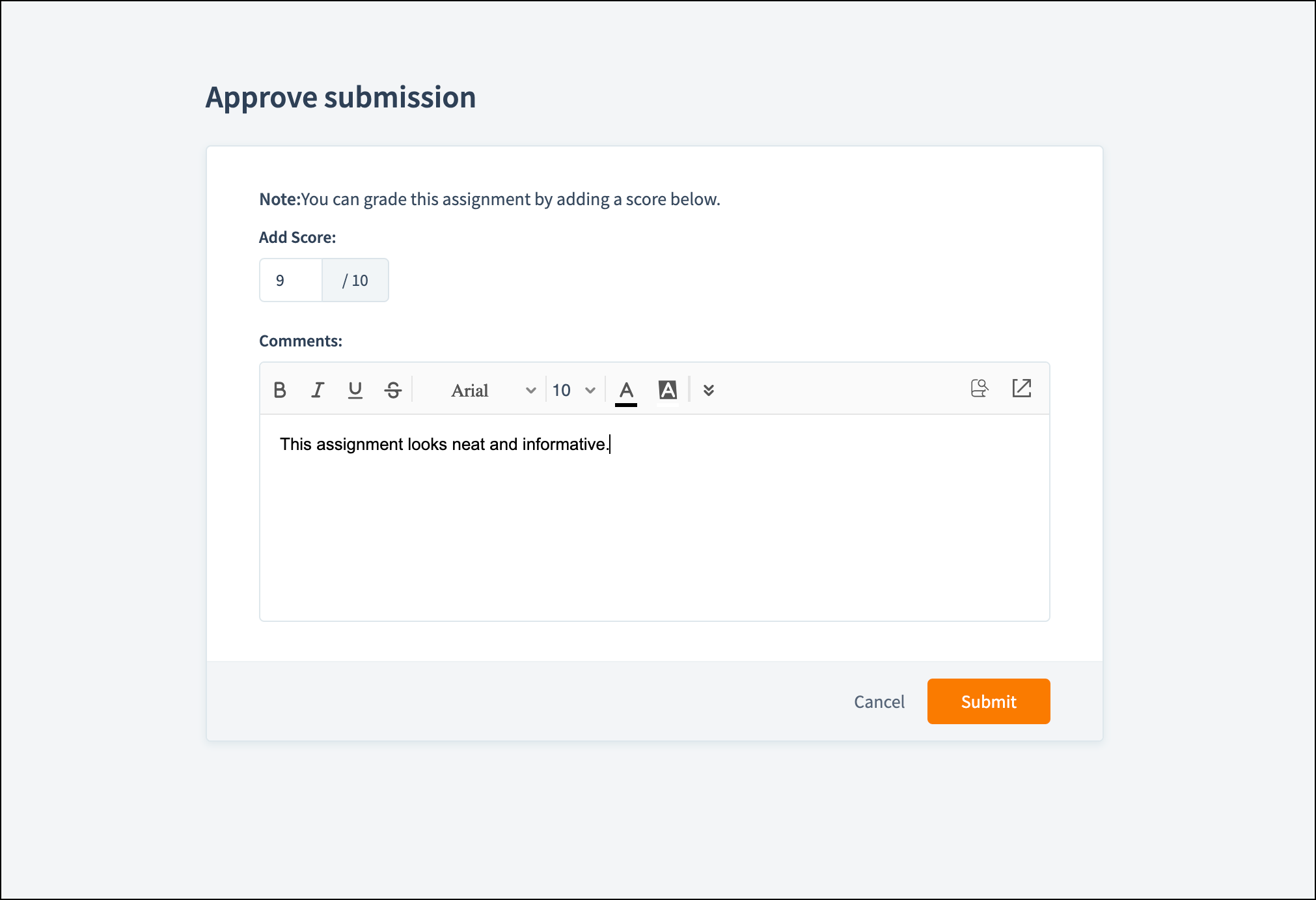 5. If you choose to approve the learner's submission, you can grade it and add any additional comments regarding the same. The comment section is incorporated with a rich text editor, so you can highlight and format the comments.