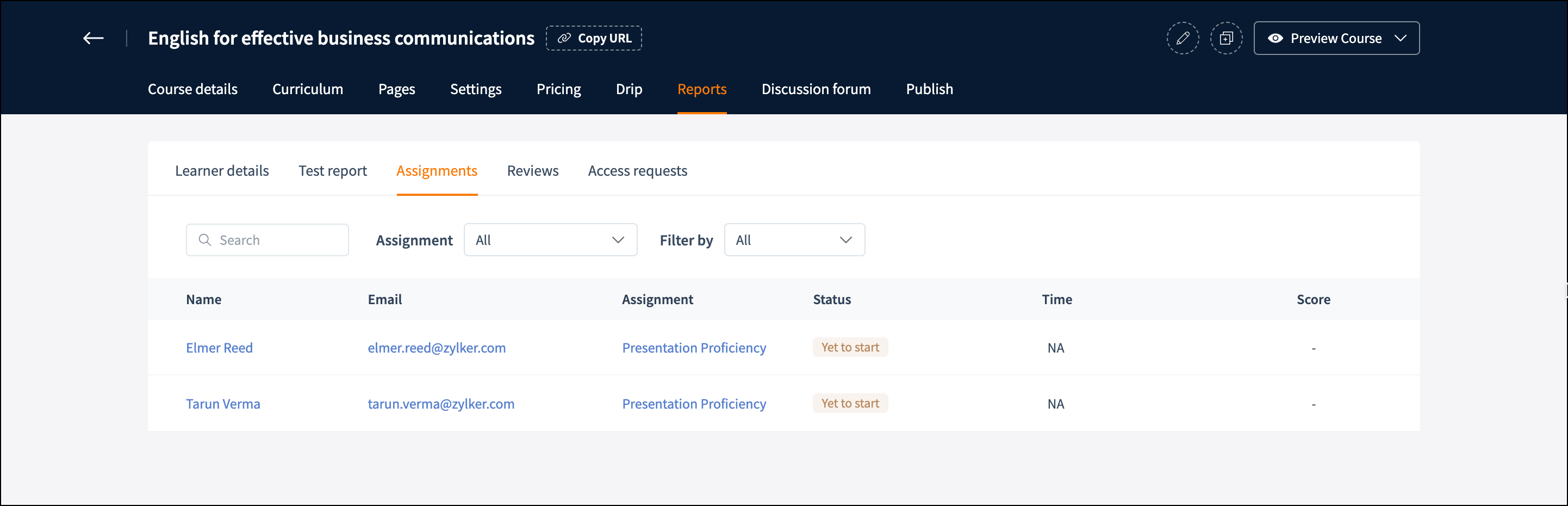 3. Once the course is published, your learners can proceed to submit their assignments. When an assignment is submitted by a learner, it will be available for review and grading under the Reports section.