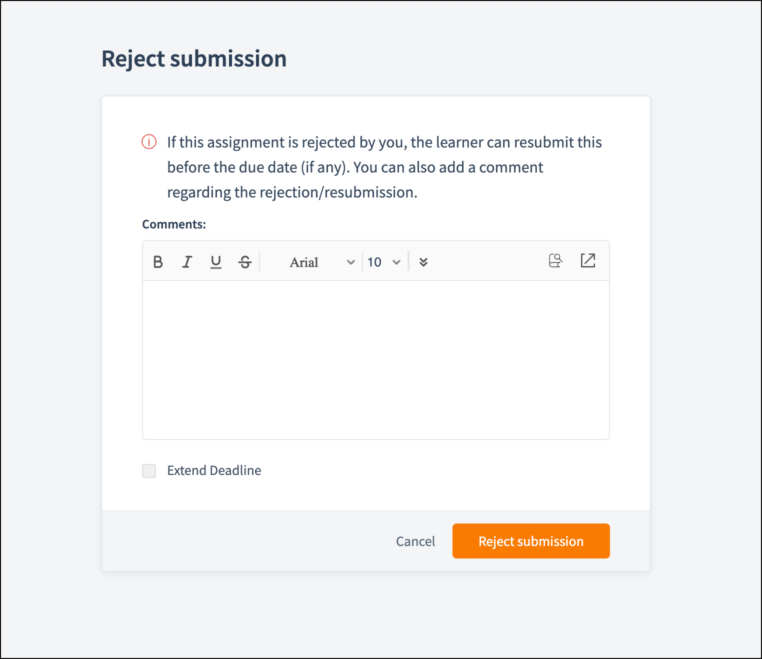 6. If in case you wish to reject the submission and have the learner resubmit the assignment, you can click on Reject and even extend the assignment due date to facilitate resubmission.