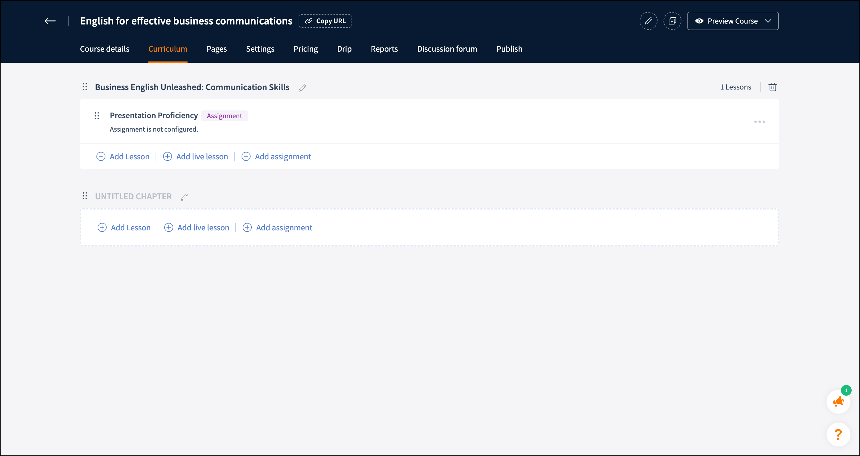 1. Click Add Assignment under the Curriculum tab after you create a course.