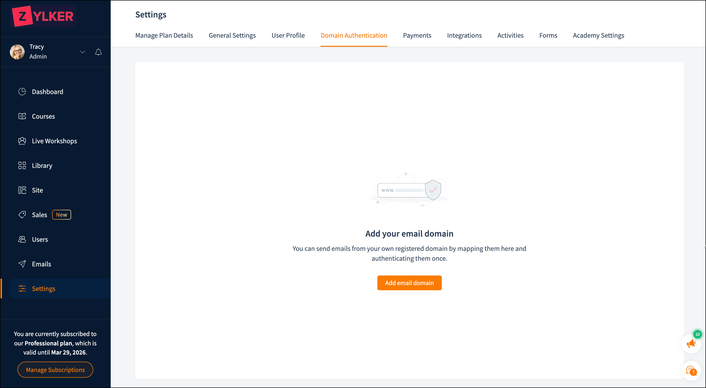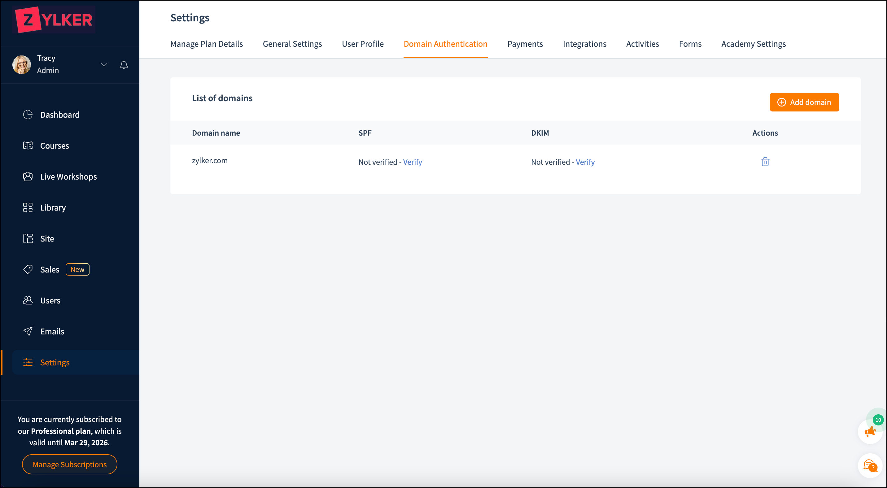 - After logging in to TrainerCentral, click on Settings from the left pane and select the Domain Authentication tab .