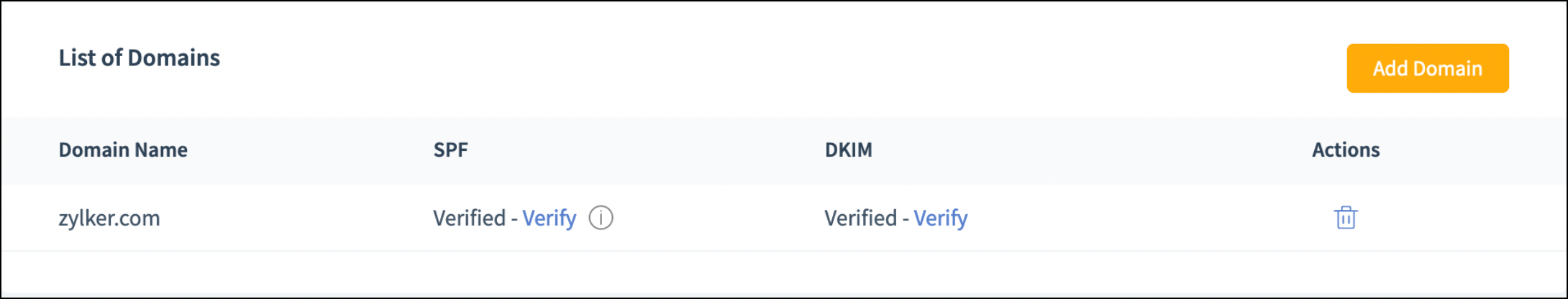 - Once your preferred email domain has been added, click on Verify under the SPF/DKIM columns.