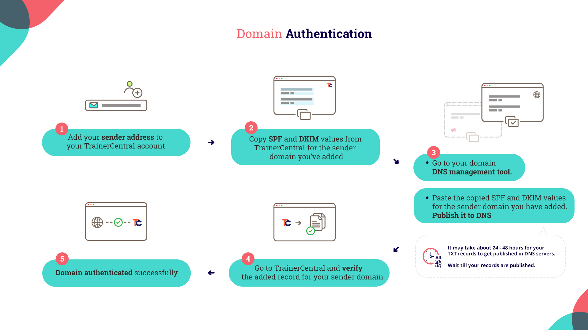 Authenticating your domain in TrainerCentral is a simple four step process: