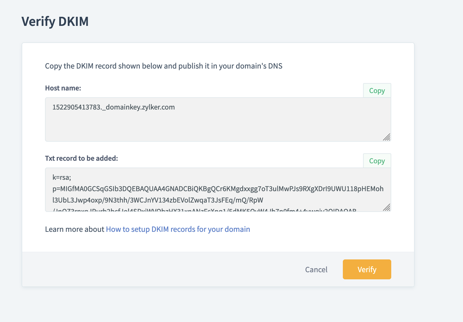 Warning: If the host name shown above doesn't work, kindly refer to the instructions shared by your DNS provider. For example, certain DNS providers instruct you to add only until 1522905413783_domainkey (without including the domain 'gmail.com') - please refer to these instructions carefully for the DKIM records to be configured successfully.