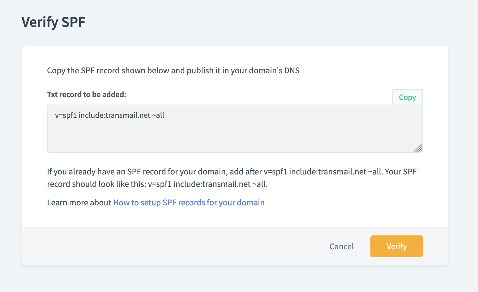 After the SPF and DKIM records for your domain have been published on the DNS servers, follow the steps given below to verify your domain:
