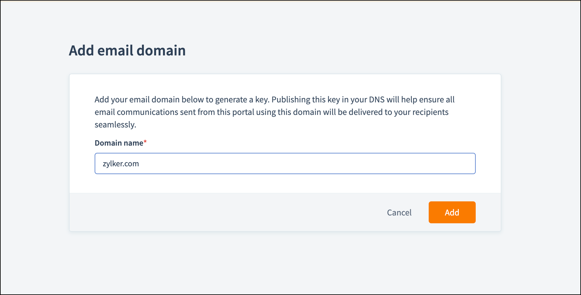 2. Select Add email domain and enter the domain address that you've added in your Email contact tab.