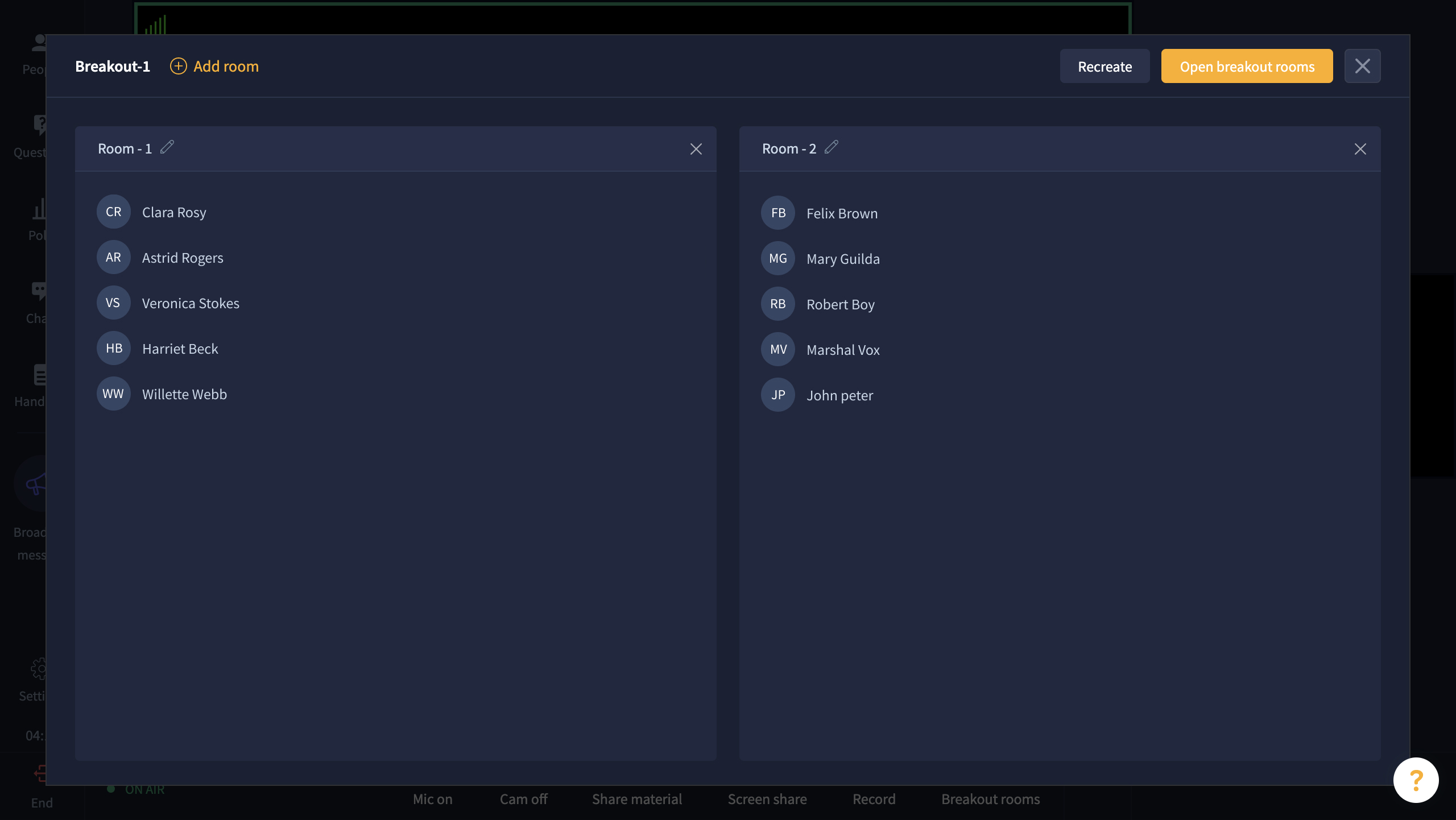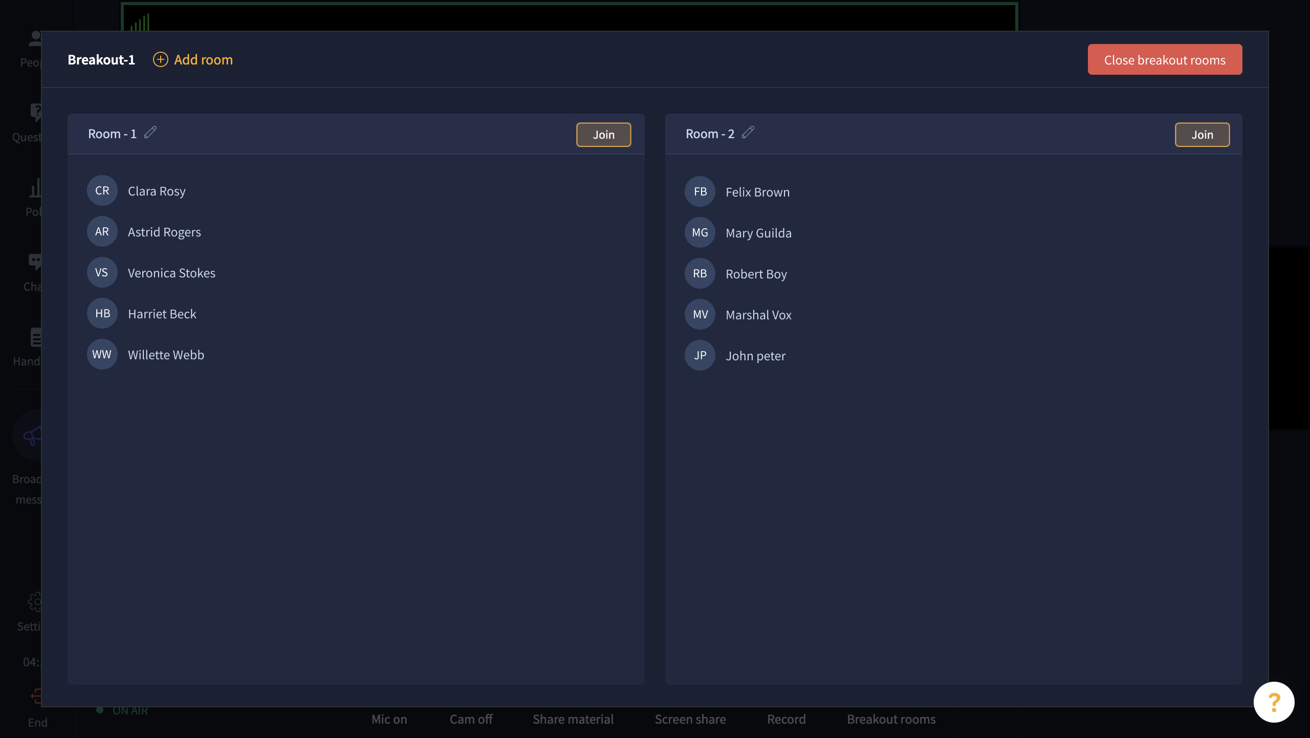 4. Once participants have been allocated their respective rooms, you can click on Open breakout rooms on the top right to launch the breakout session.