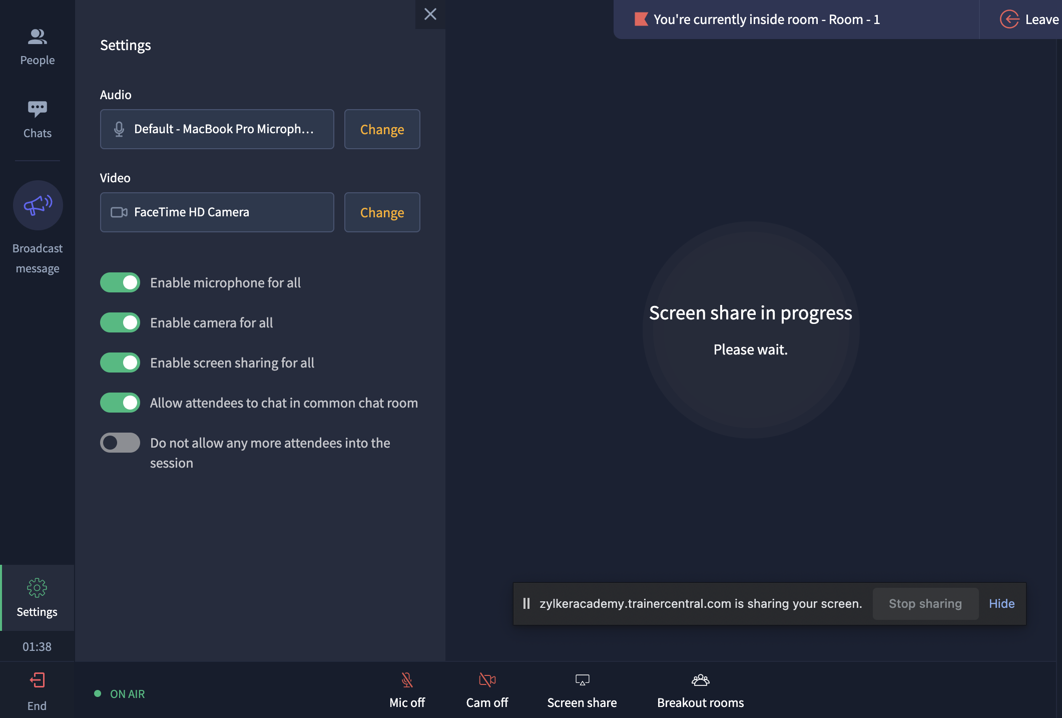 TrainerCentral allows you to broadcast your voice and video, screen share, showcase videos and present slideshows to attendees in different locations. By default, when you begin, TrainerCentral audio and video will be enabled. You can start a session ...