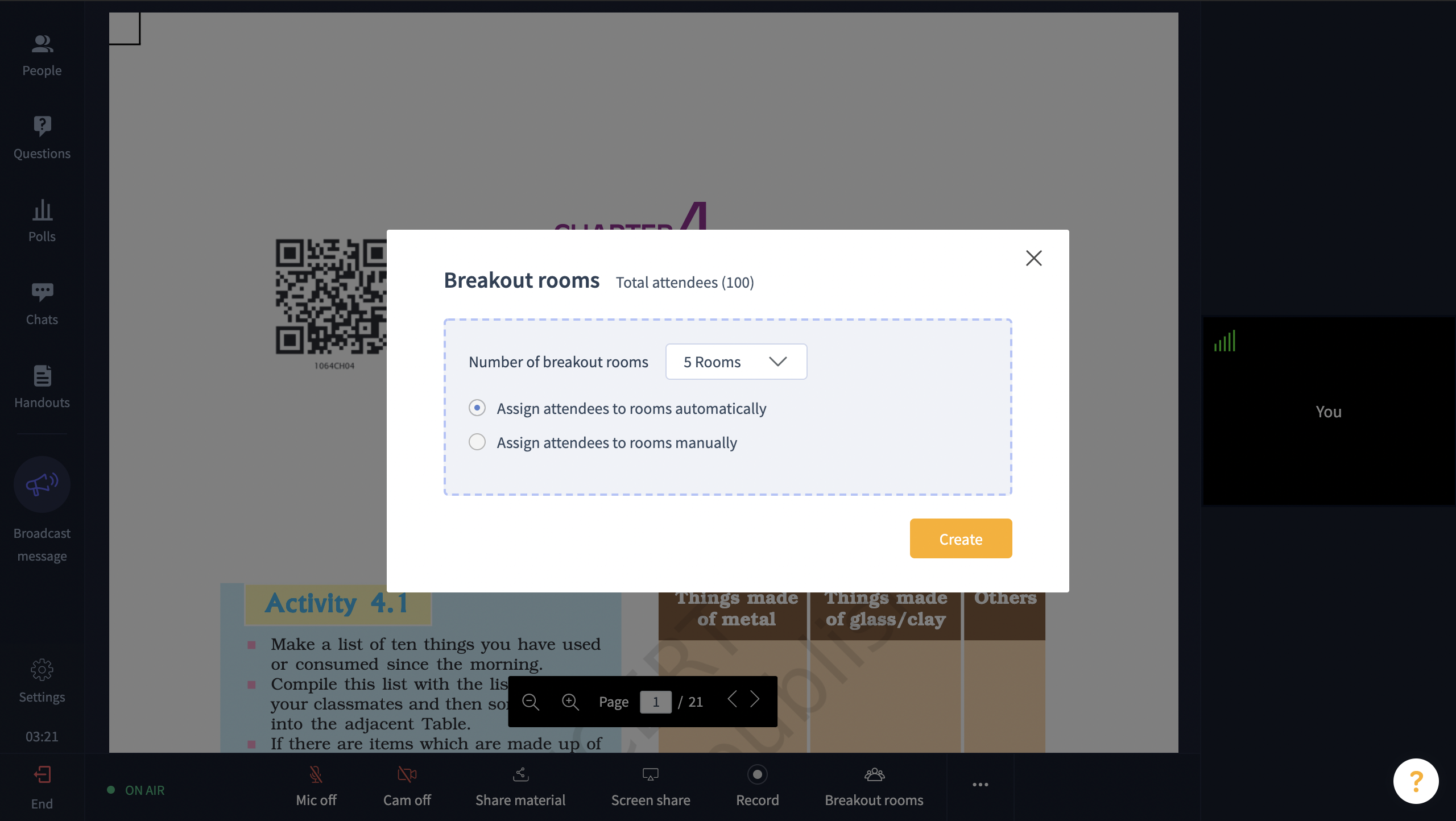 For example, if you have 100 participants in a session, you can split them into 10 groups with 10 learners each and have different tasks/lesson schedule running in each room.