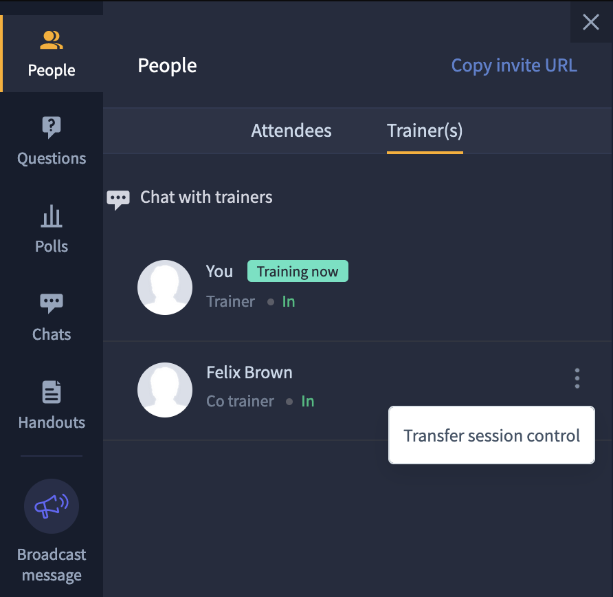 To give a co-trainer control over a session, click on the Transfer session control icon.