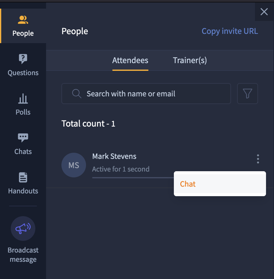 An attendee can also initiate a private chat with the trainers in a session by clicking on Chat with trainers in the Chats pane.
