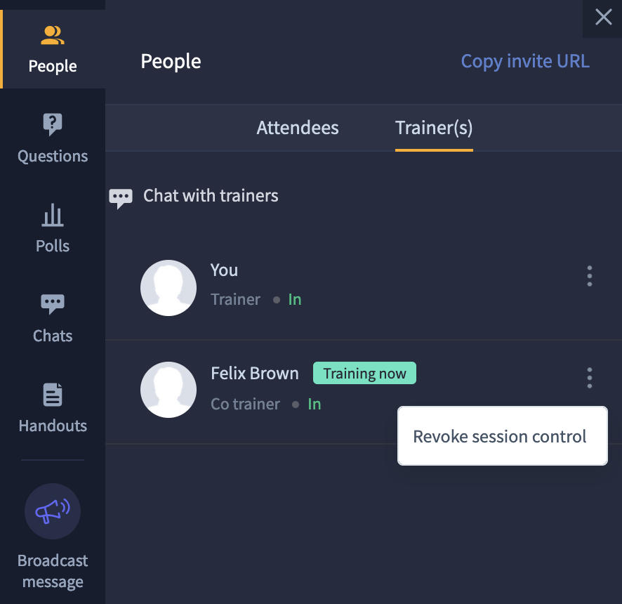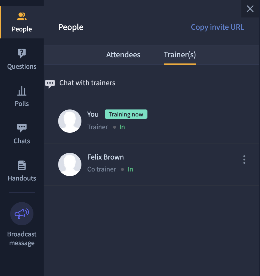 Enrich your training sessions by adding a co-trainer. Co-trainers are people from your organization who can be added to your live remote sessions to act as moderators. They can assist you in answering questions, engaging your participants via chat, and even deliver a segment of the training session. Having more than one trainer in your session can offer an enhanced learning experience for your trainees.