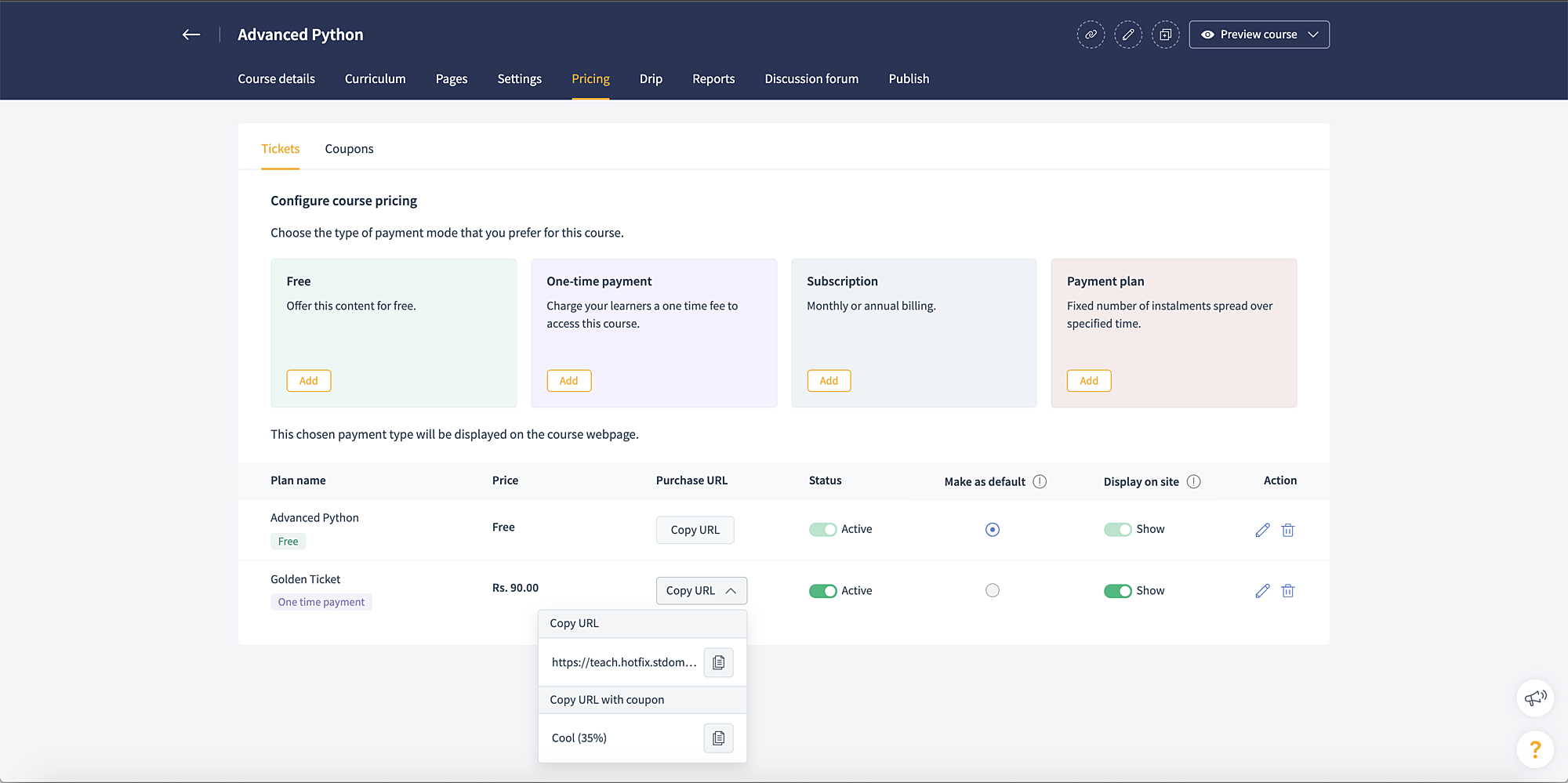 Coupons can be used to offer your course at a discounted price to your learners. Once you create a coupon, you can share it with your prospects. They can use this code to purchase the course at a lower price