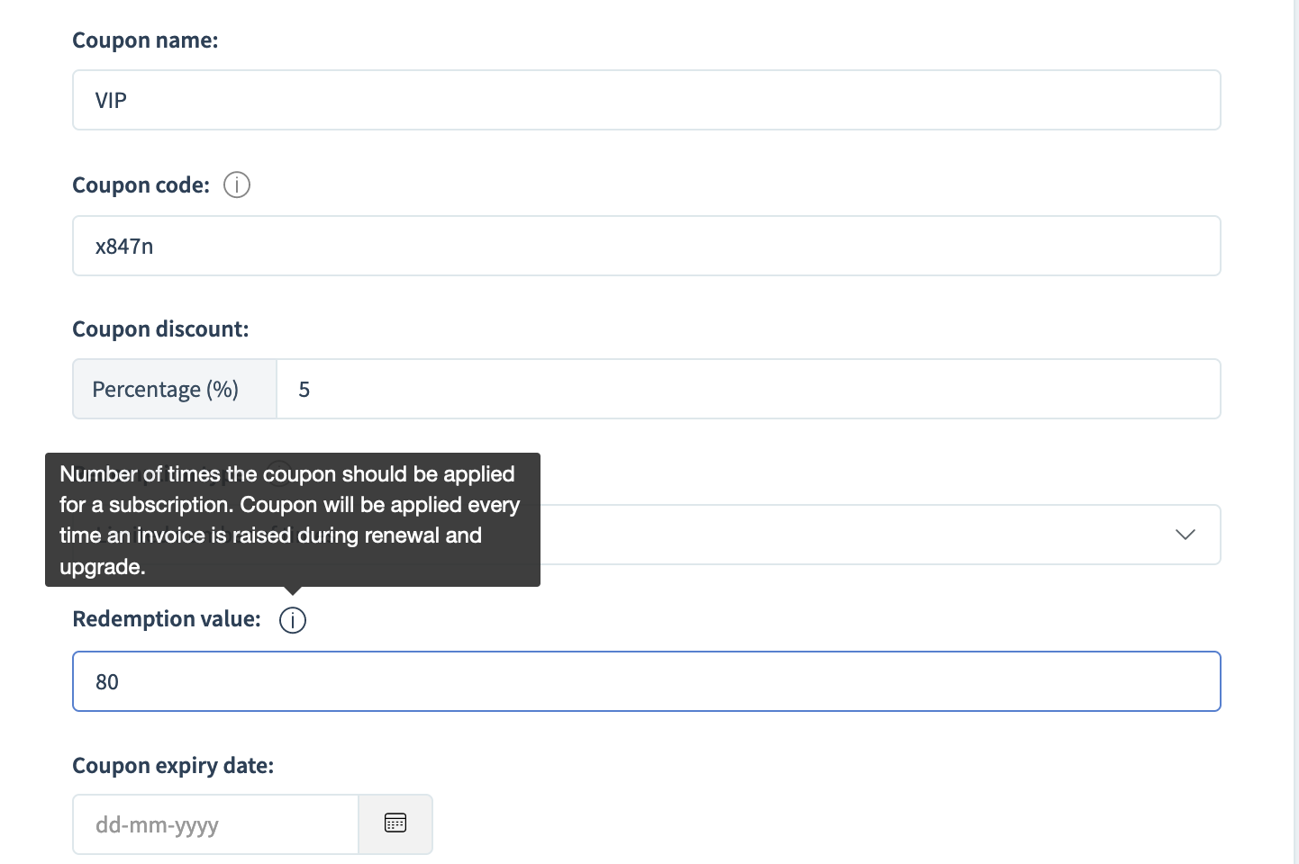 The number of times a coupon can be redeemed: The maximum number of times a coupon can be used by a single learner. This is useful especially in the case of subscription or payment plan ticketing modes. For example, if you specify 5 (in the field), then the coupon can be used for first 5 subscription billing cycles for the purchased ticket for a particular learner.