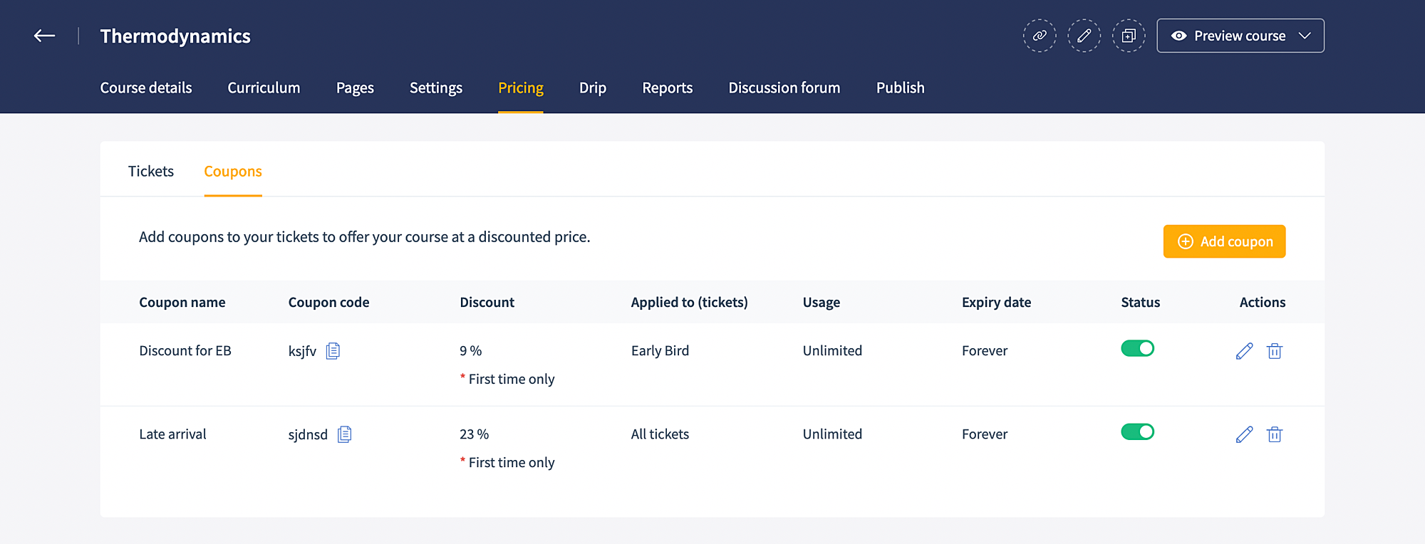 To edit or delete coupon, navigate to the coupon tab under a course and use the edit or delete icon from the Actions column, as shown below.
