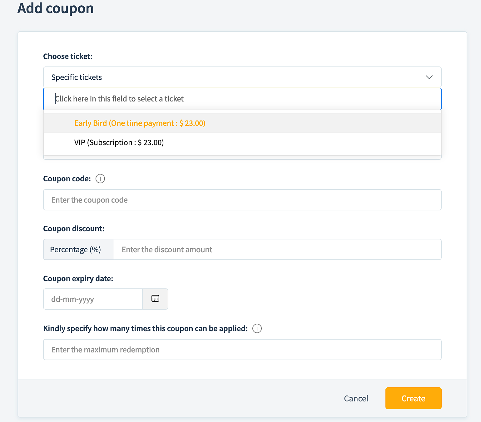 Click on Create Coupon and choose the tickets you wish to apply the coupon for.