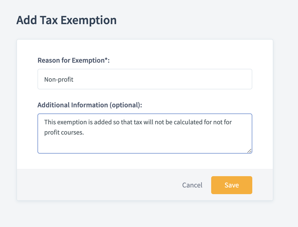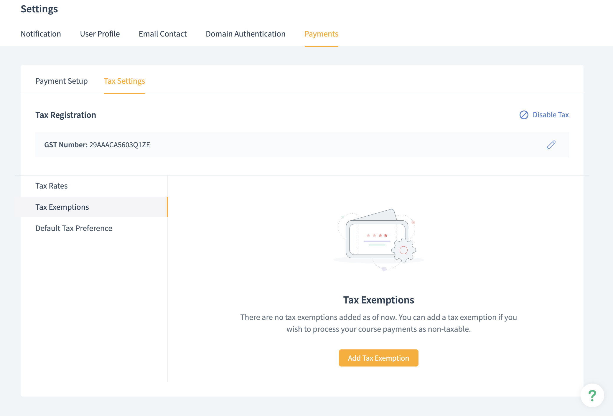 Tax exemptions are allowances that you can configure so that taxes do not apply to your course tickets. If incase, you wish to offer your course price without adding taxes, or you wish to account your course sales as non-taxable to suit your convenience, you can add these tax exemptions to your academy which you can use across all your tickets.