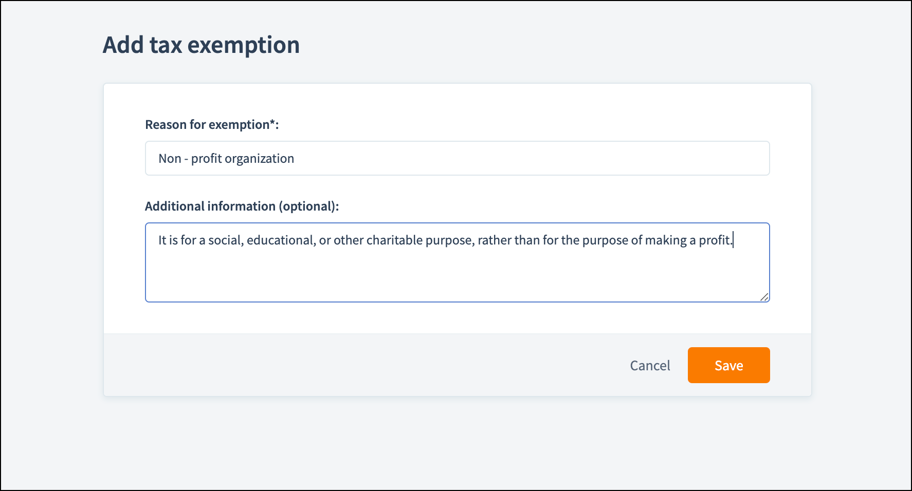 - Select Add exemption, and in the Add tax exemption window enter the Reason for exemption and Additional information (optional).