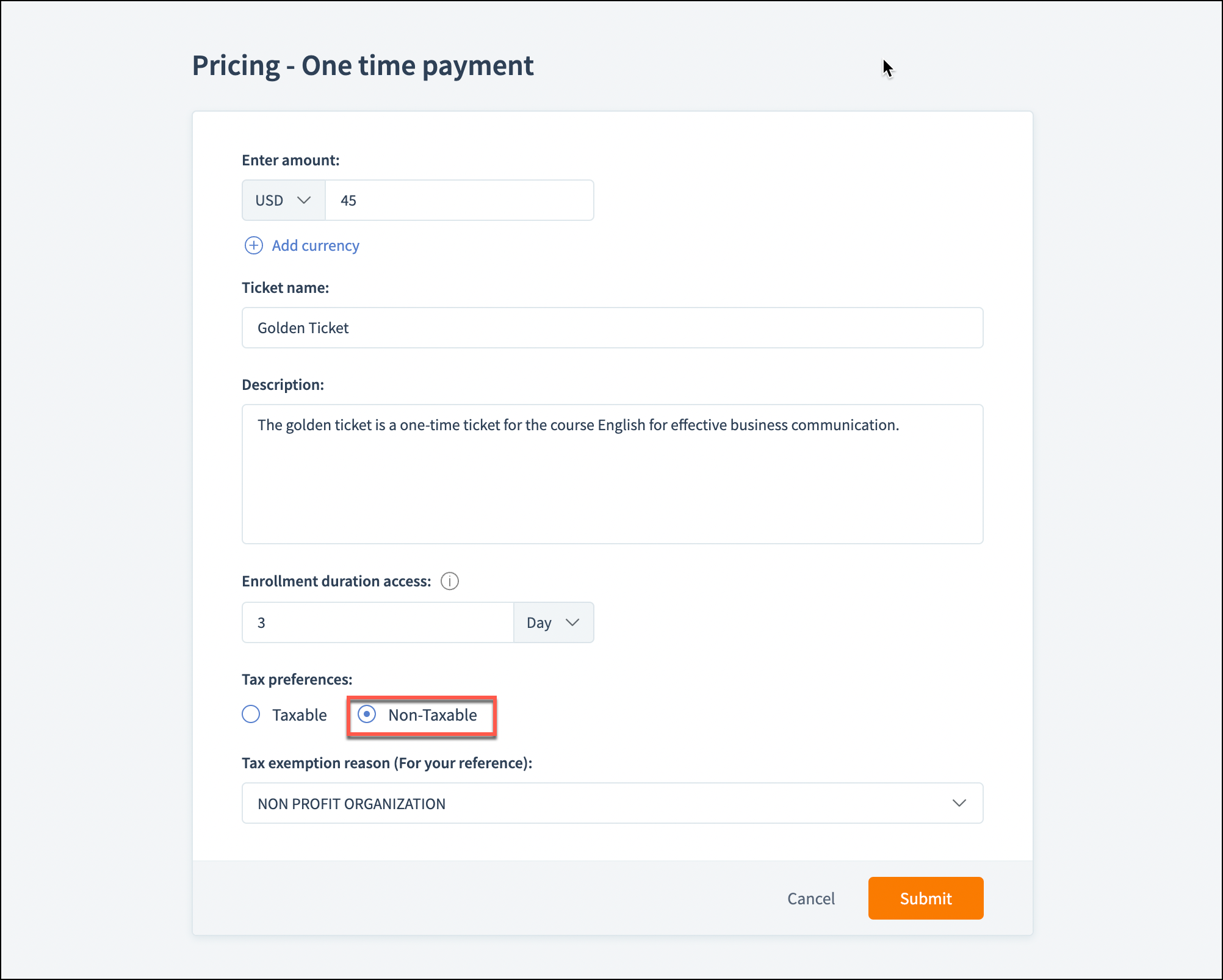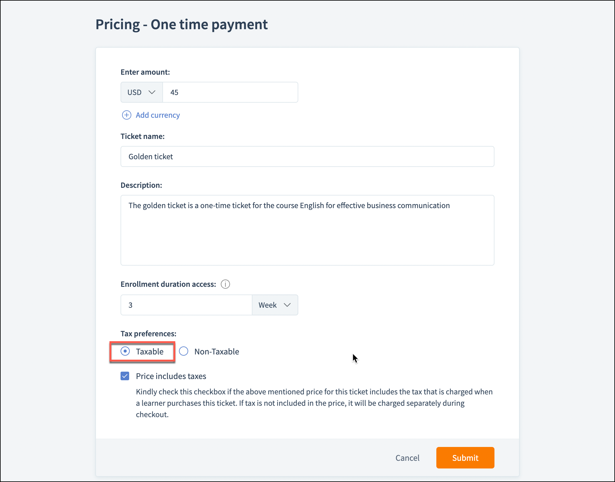 - Select the Price includes taxes checkbox if the ticket amount already includes the tax rate and the learner is expected to pay it during the purchase.