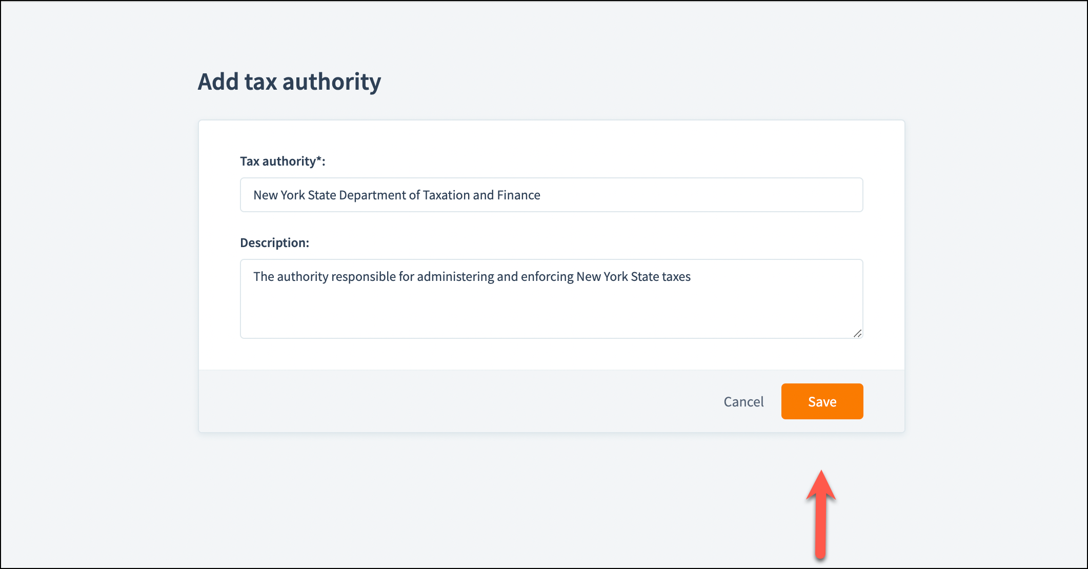 The tax authorities saved will be displayed in the "Tax authorities section." You can edit, delete, and add tax authorities on the "Tax authorities" screen.
