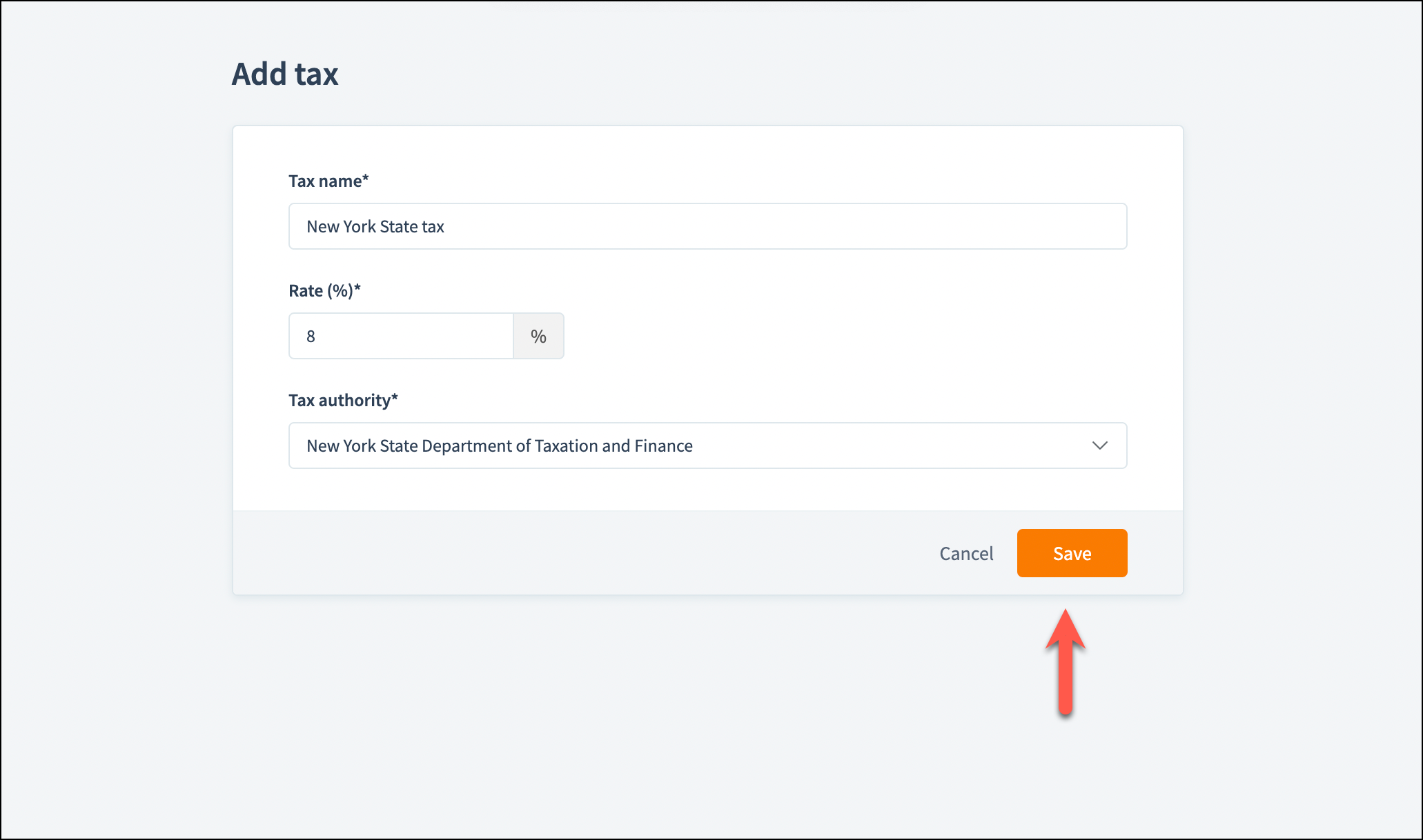 - Select Add tax and in the Add tax window, specify a tax name for your tax rate, enter the rate, and choose the tax authority from the list created earlier.