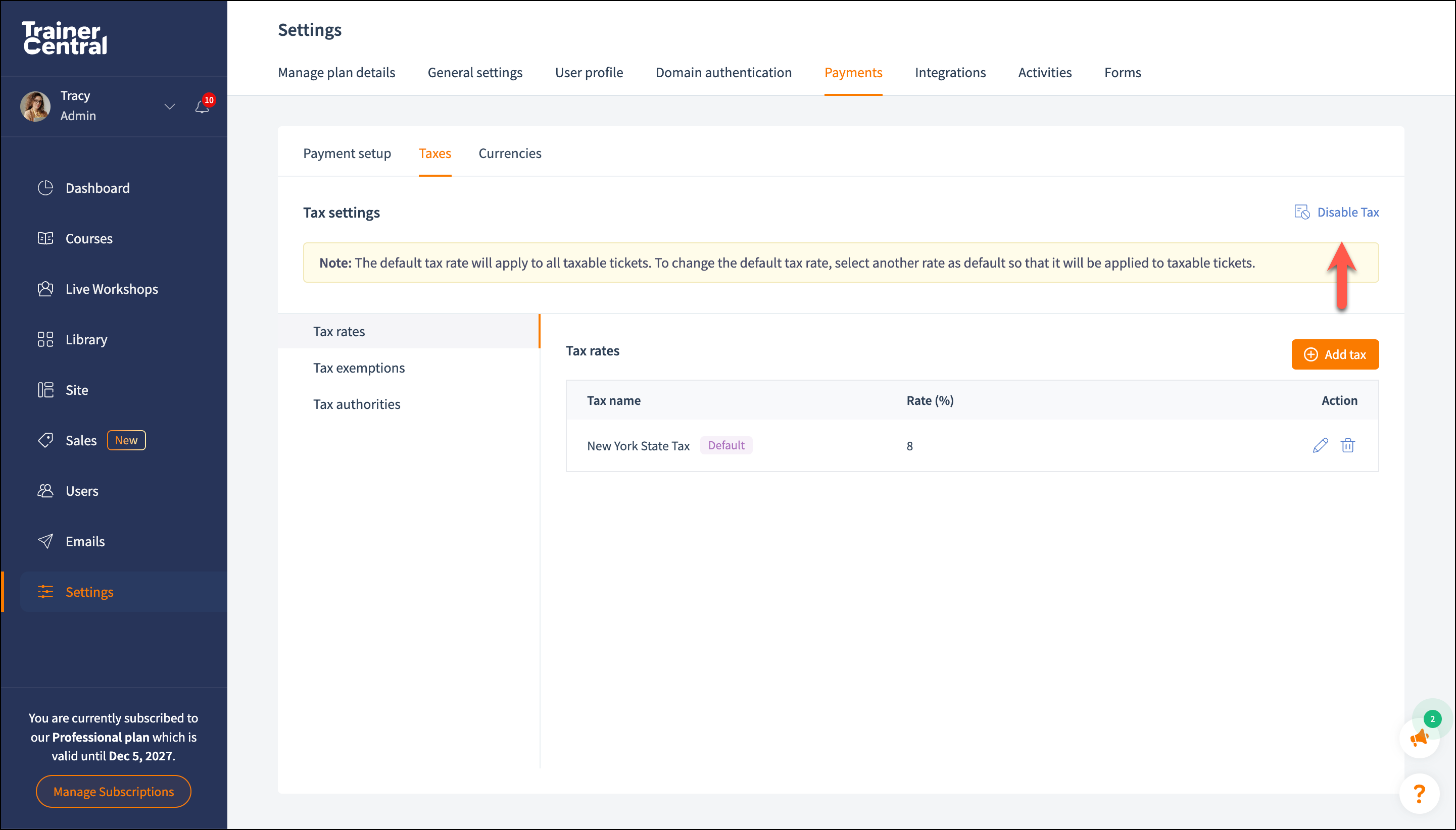 Click Disable Tax in the right corner of the screen. Once you disable it, you will not be able to set up taxes for your academy until you enable it again.