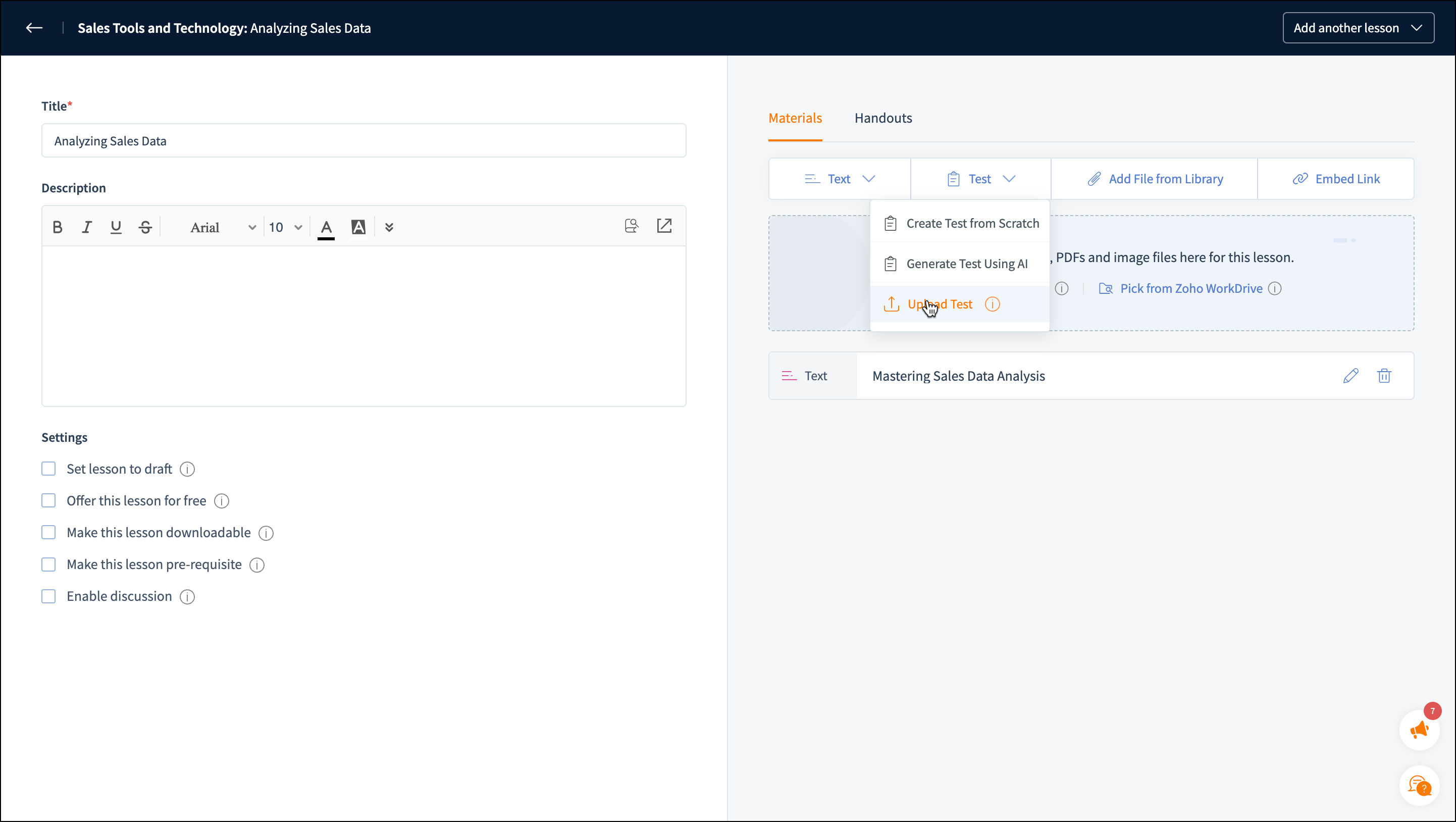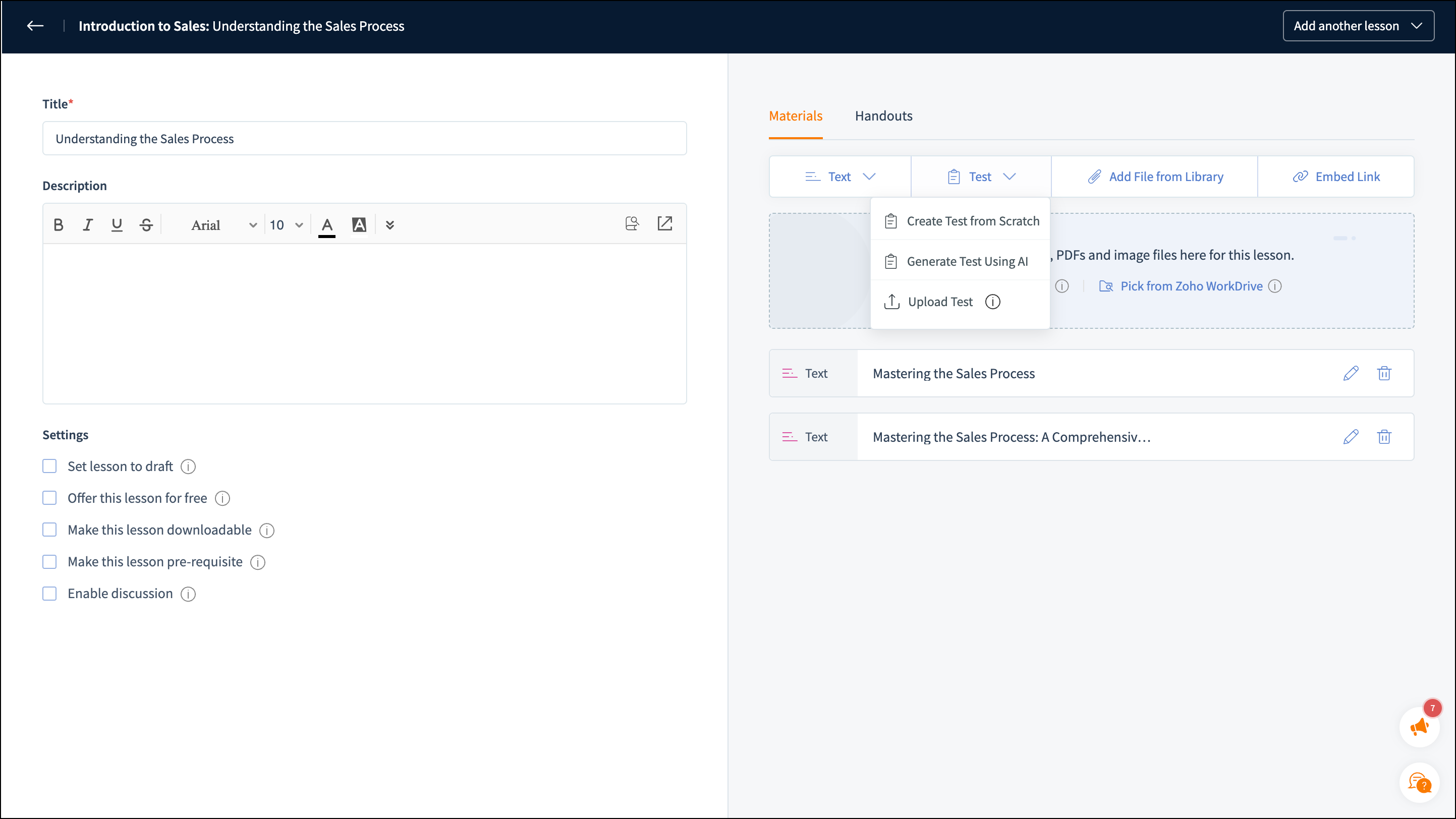 - Configure a test for this lesson by clicking Test under the Materials tab on the right side of the Add Lesson page.