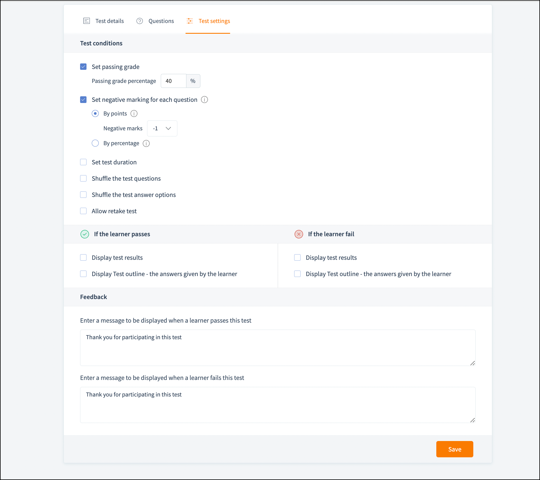 - Feedback: You can display customized messages to your learners when they pass or fail the test. These messages can serve as motivation and will be displayed after the test.