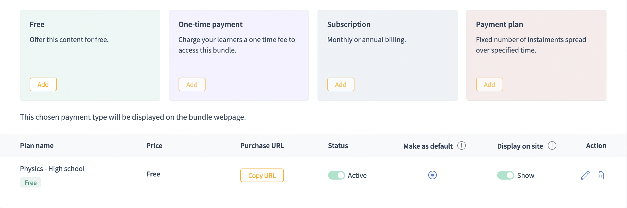 You can configure the pricing of a bundle with various payment options like One-time payment, subscription plan, payment installments etc.