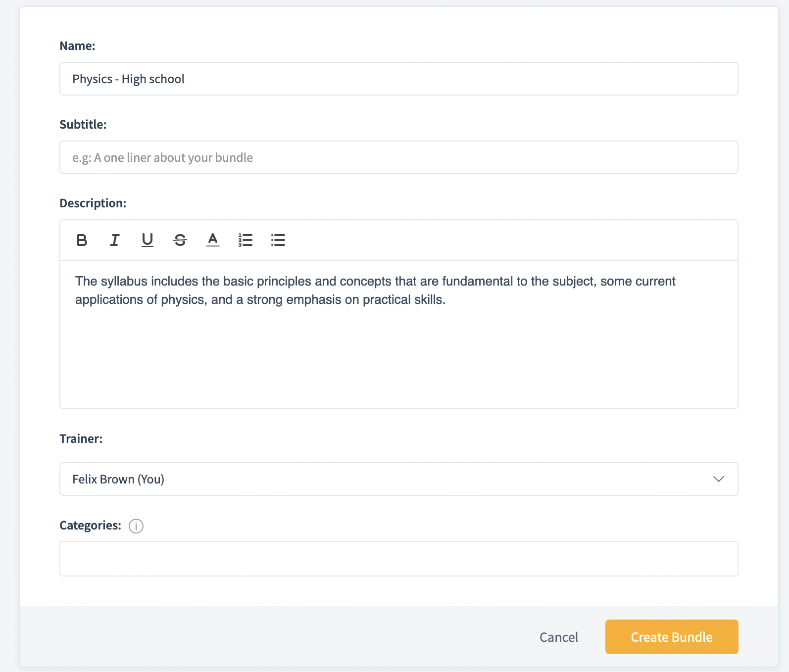 2. You can add a bundle name, description and choose a trainer for your bundle and click on Create Bundle.