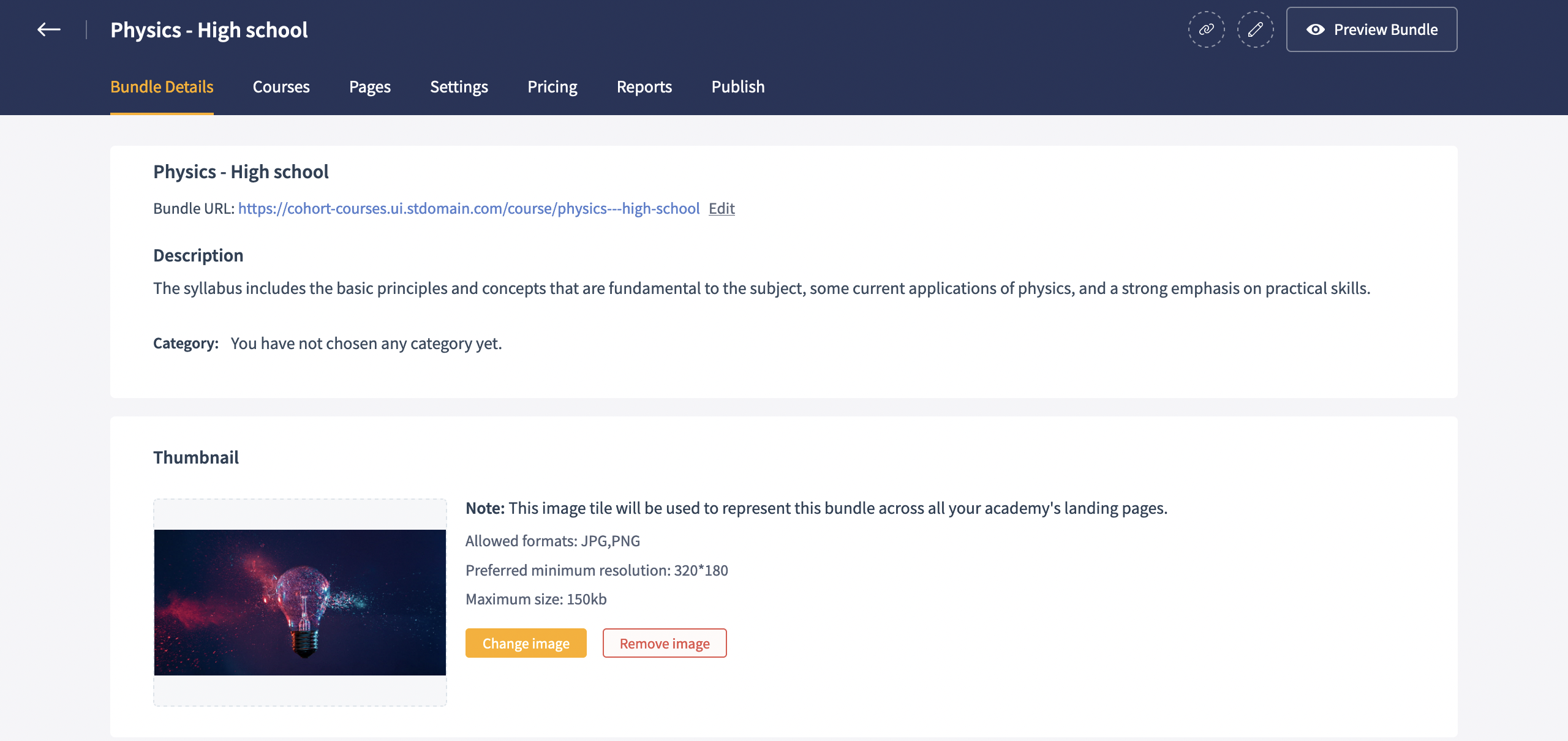 The Bundle Details page allows you to modify the bundle title, description and even add an thumbnail image to your bundle.