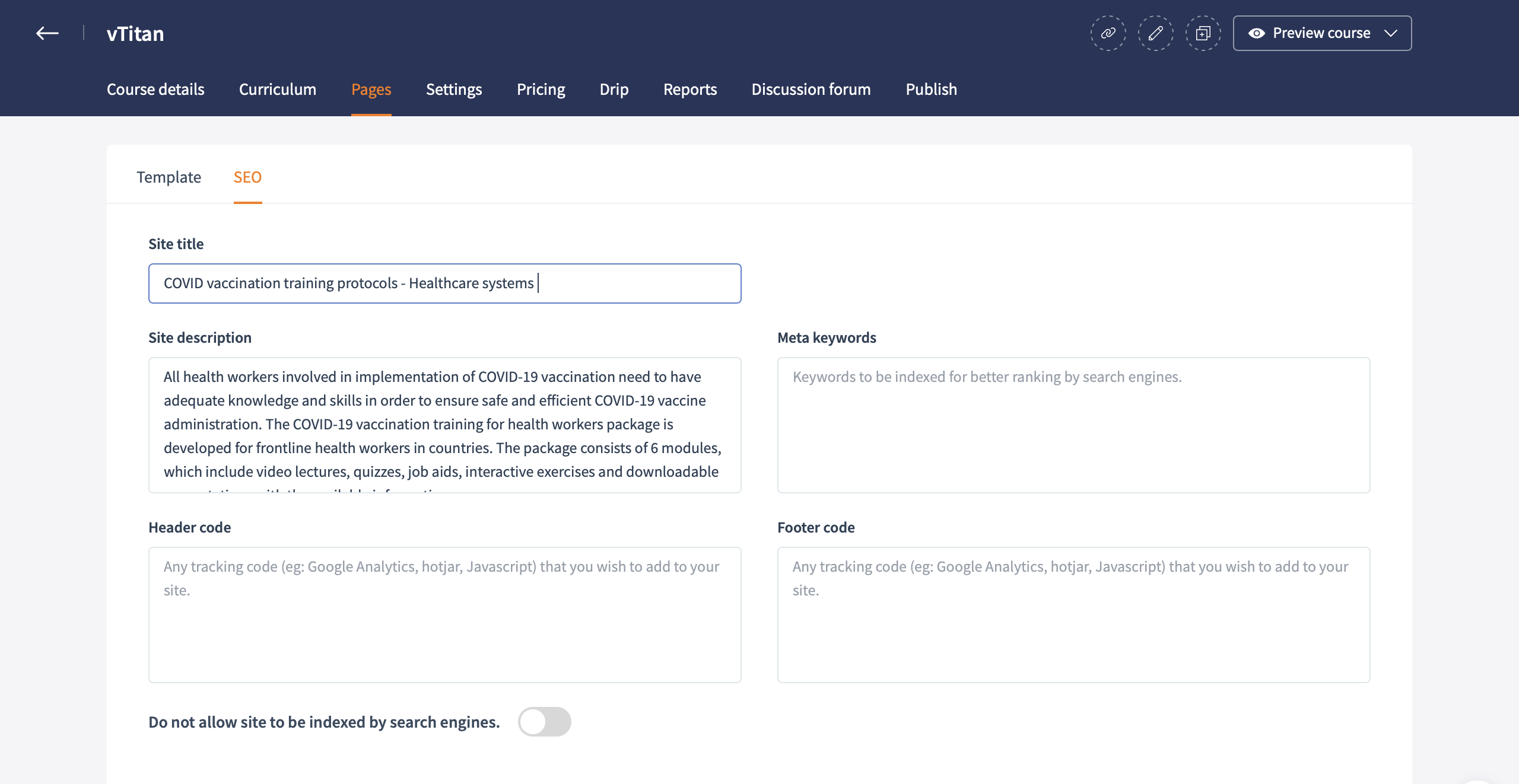 If for any reason you do not want your site to be indexed by search engines, you can always go to "Do not allow site to be indexed by search engines" and toggle that setting on. This could be useful when your course is not quite ready to take in learners yet or your PR activities might still be in the funnel for the grand launch of your courses. For whatever reason, you can easily choose to NOT show your school site in any search engine's results if you wish.