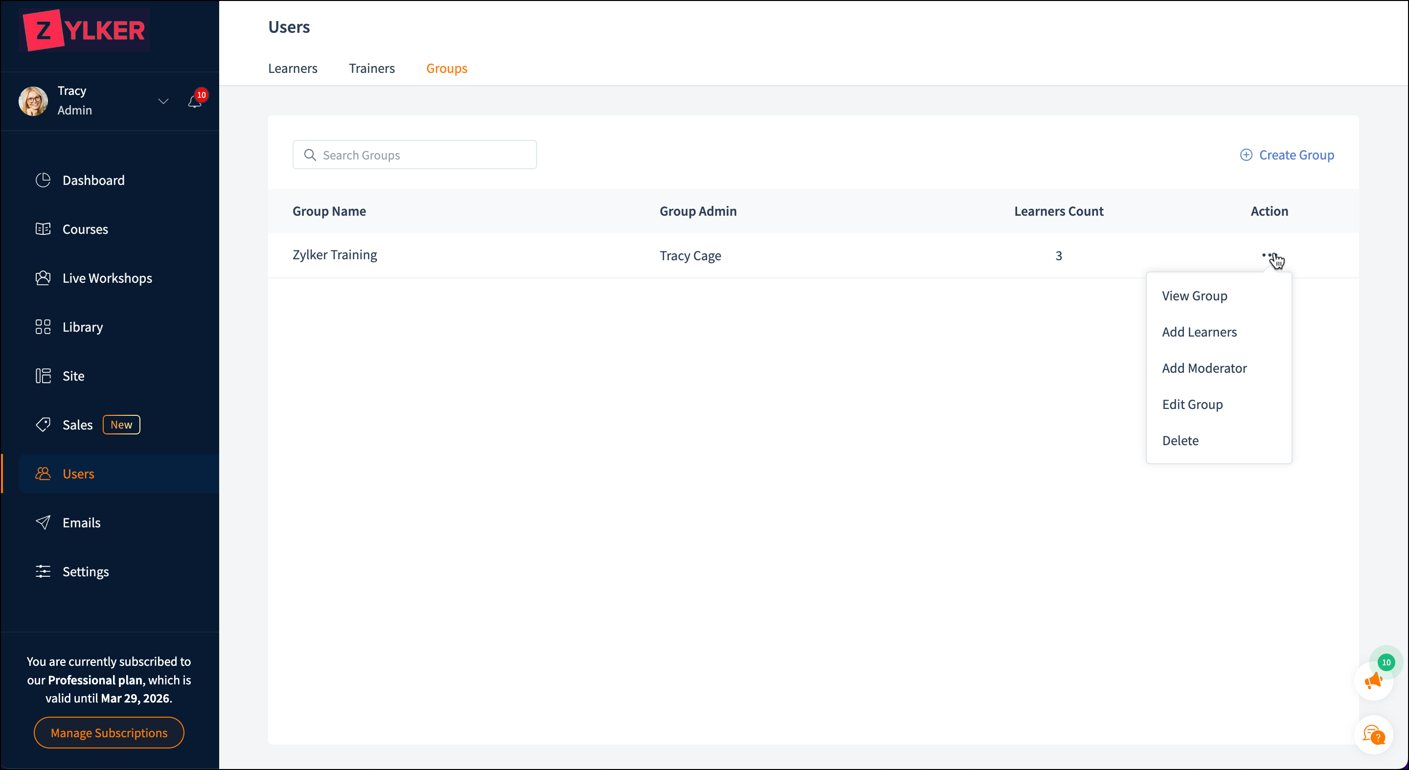 Let's consider a scenario, we have an organization called Zylker Associates and are using TrainerCentral to train their employees. Now the admin is creating multiple department groups and assigning employees to their respective groups. Once the groups are created, the admin wants to assign the lead or the manager as a moderator who is also a part of the group, so that they can monitor the course progress of their team members and stay updated. This makes the monitoring process easy.