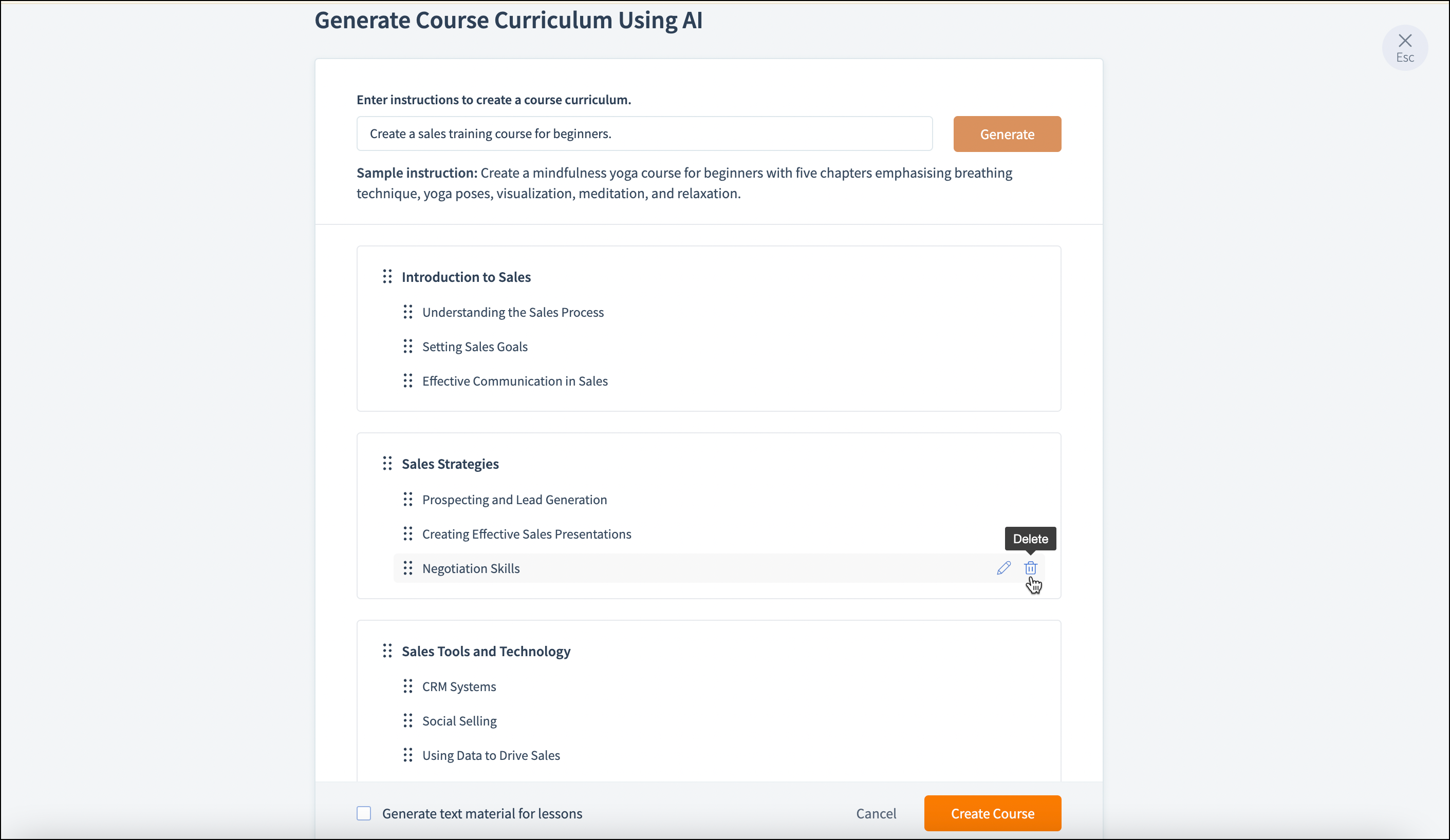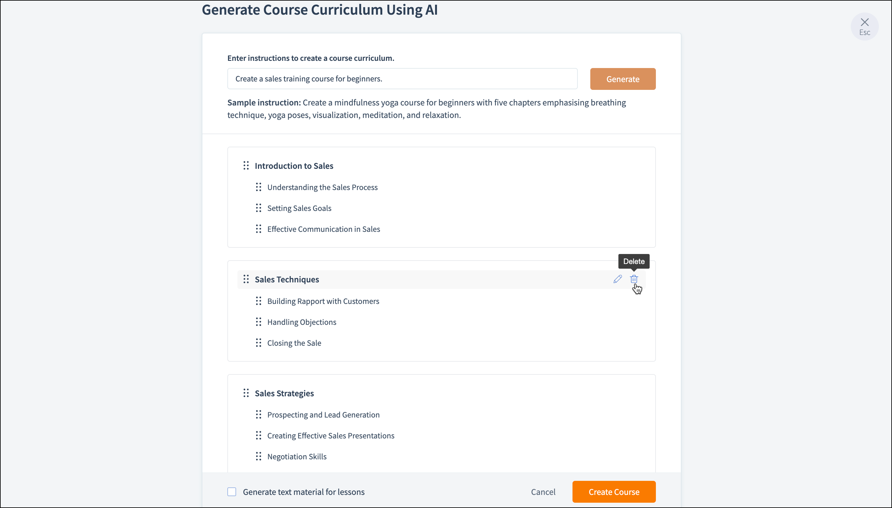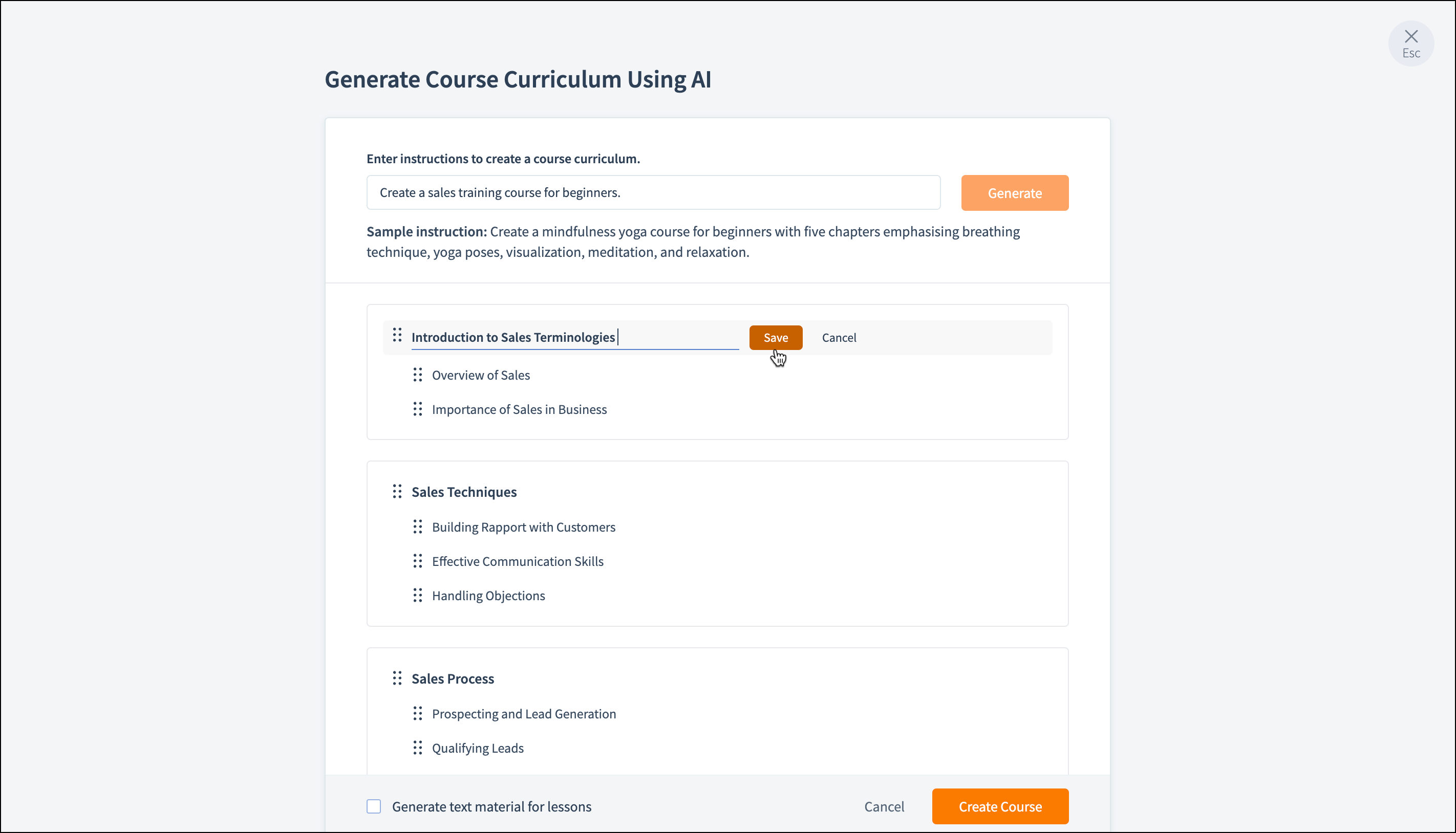 Once the course curriculum is generated, you can edit and delete the chapter and lesson title.