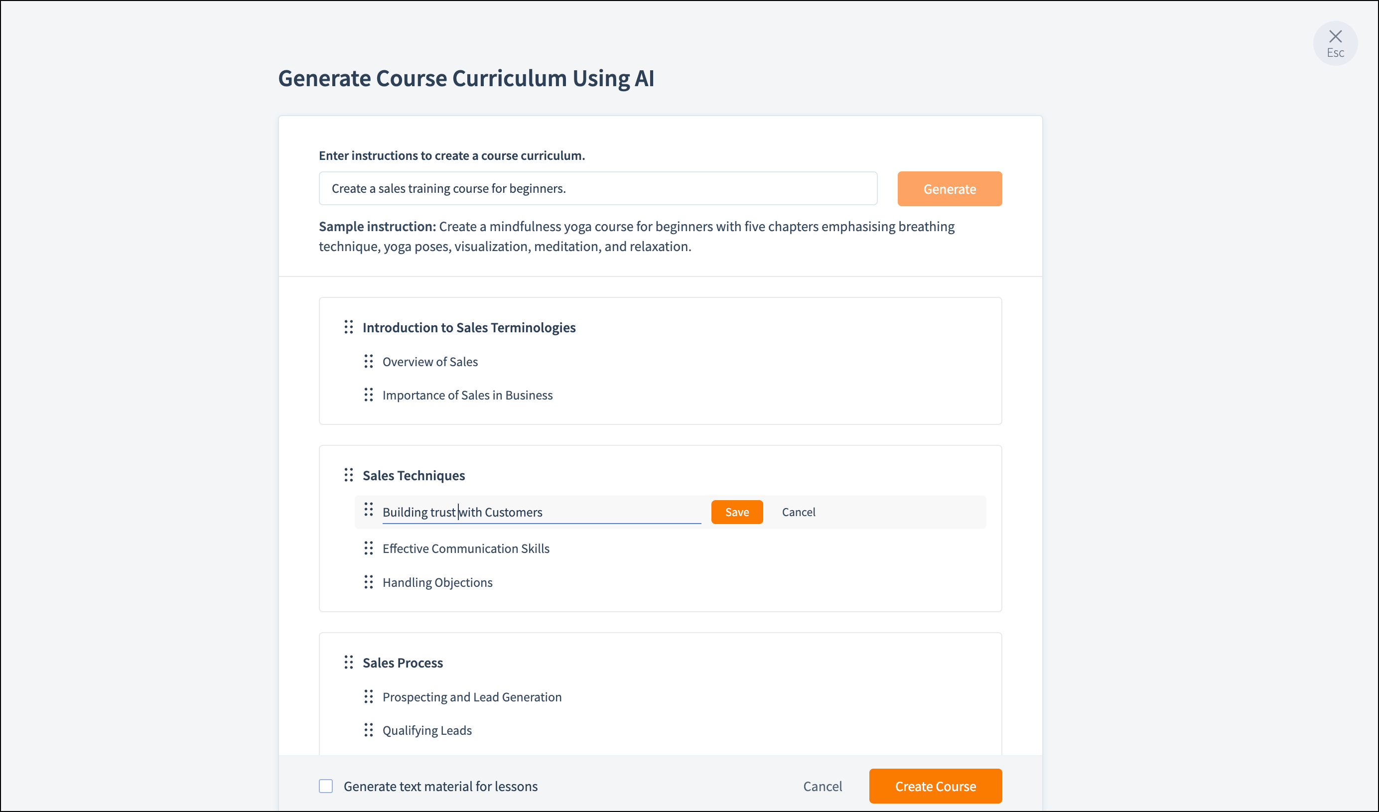 - Click the Generate button. The AI-generated course curriculum will be displayed.