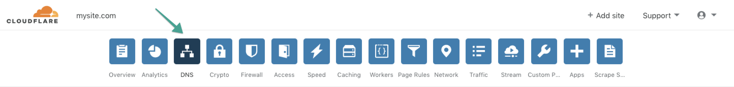 1. Log in to your CloudFlare account and in the top menu, select DNS.